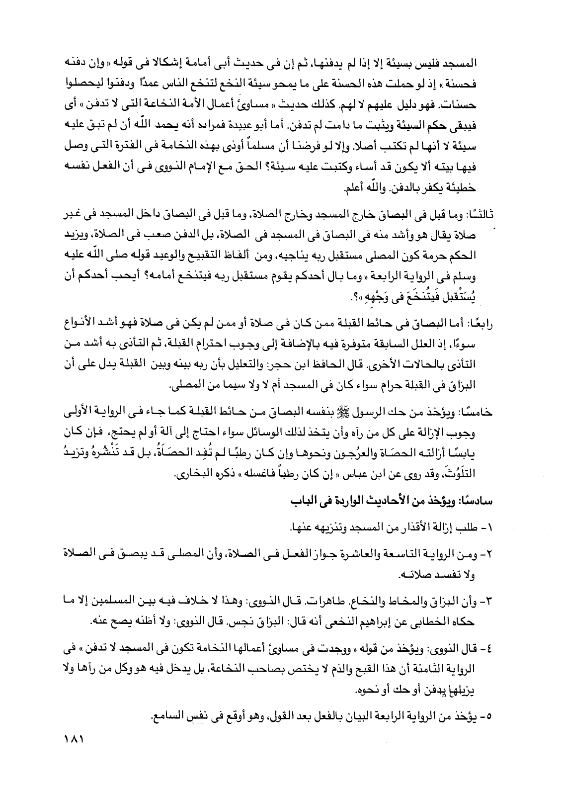المسجد فليس بسيئة إلا إذا لم يدفنها، ثم إن في حديث أبي أمامة إشكالاً في قوله "وإن دفنه فحسنة" إذ لو حملت هذه الحسنة على ما يمحو سيئة النخع لتنخع الناس عمدًا ودفنوا ليحصلوا حسنات. فهو دليل عليهم لا لهم. كذلك حديث "مساوئ أعمال الأمة النخاعة التي لا تدفن" أي فيبقى حكم السيئة ويثبت مادامت لم تدفن. أما أبو عبيدة فمراده أنه يحمد الله أن لم تبق عليه سيئة لا أنها لم تكتب أصلاً. وإلا لو فرضنا أن مسلمًا أوذي بهذه النخامة في الفترة التي وصل فيها بيته ألا يكون قد أساء وكتبت عليه سيئة؟ الحق مع الإمام النووي في أن الفعل نفسه خطيئة يكفر بالدفن. والله أعلم.