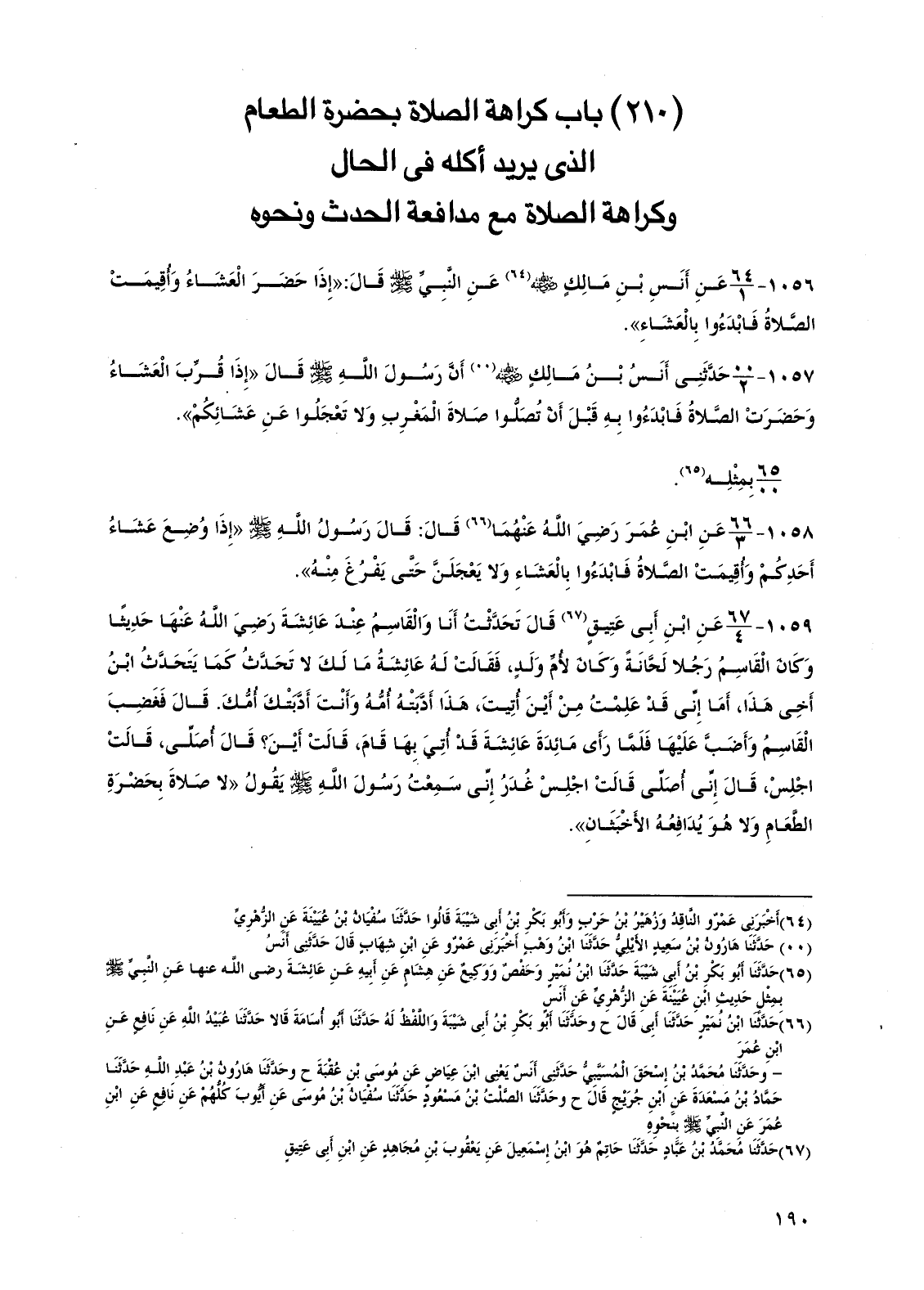 (210) باب كراهة الصلاة بحضرة الطعام الذي يريد أكله في الحال وكراهة الصلاة مع مدافعة الحدث ونحوه
