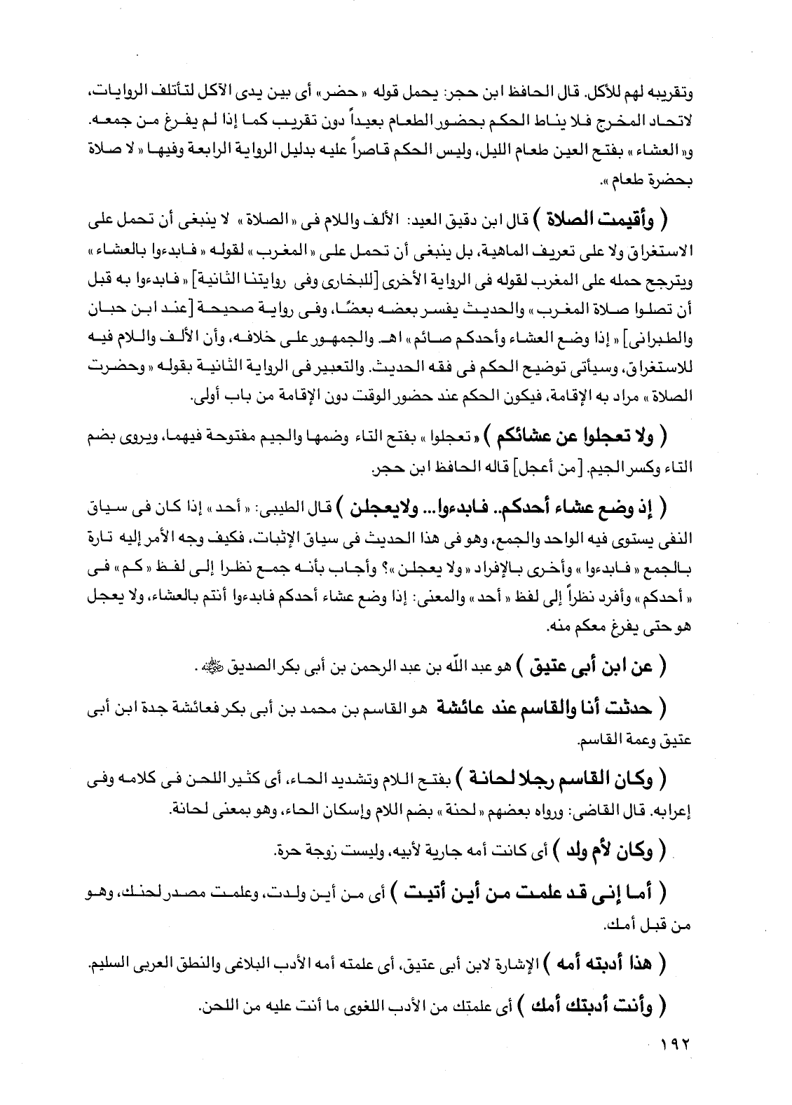 (ولا تعجلوا عن عشائكم) "تعجلوا" بفتح التاء وضمها والجيم مفتوحة فيهما، ويروى بضم التاء وكسر الجيم. [من أعجل] قاله الحافظ ابن حجر.
