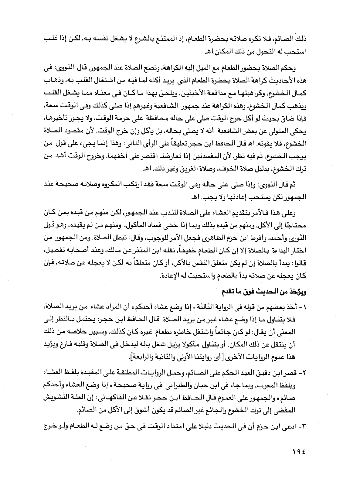 2 - قصر ابن دقيق العيد الحكم على الصائم، وحمل الروايات المطلقة على المقيدة بلفظ العشاء وبلفظ المغرب، وبما جاء في ابن حبان والطبراني في رواية صحيحة "إذا وضع العشاء وأحدكم صائم" والجمهور على العموم قال الحافظ ابن حجر نقلاً عن الفاكهاني: إن العلة التشويش المفضي إلى ترك الخشوع والجائع غير الصائم قد يكون أشوق إلى الأكل من الصائم.