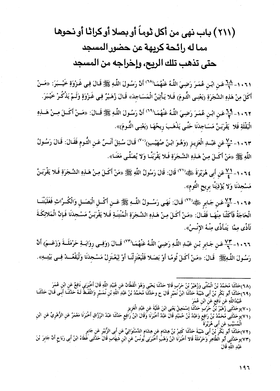 (211) باب نهي من أكل ثومًا أو بصلاً أو كراثًا أو نحوها مما له رائحة كريهة عن حضور المسجد حتى تذهب تلك الريح، وإخراجه من المسجد