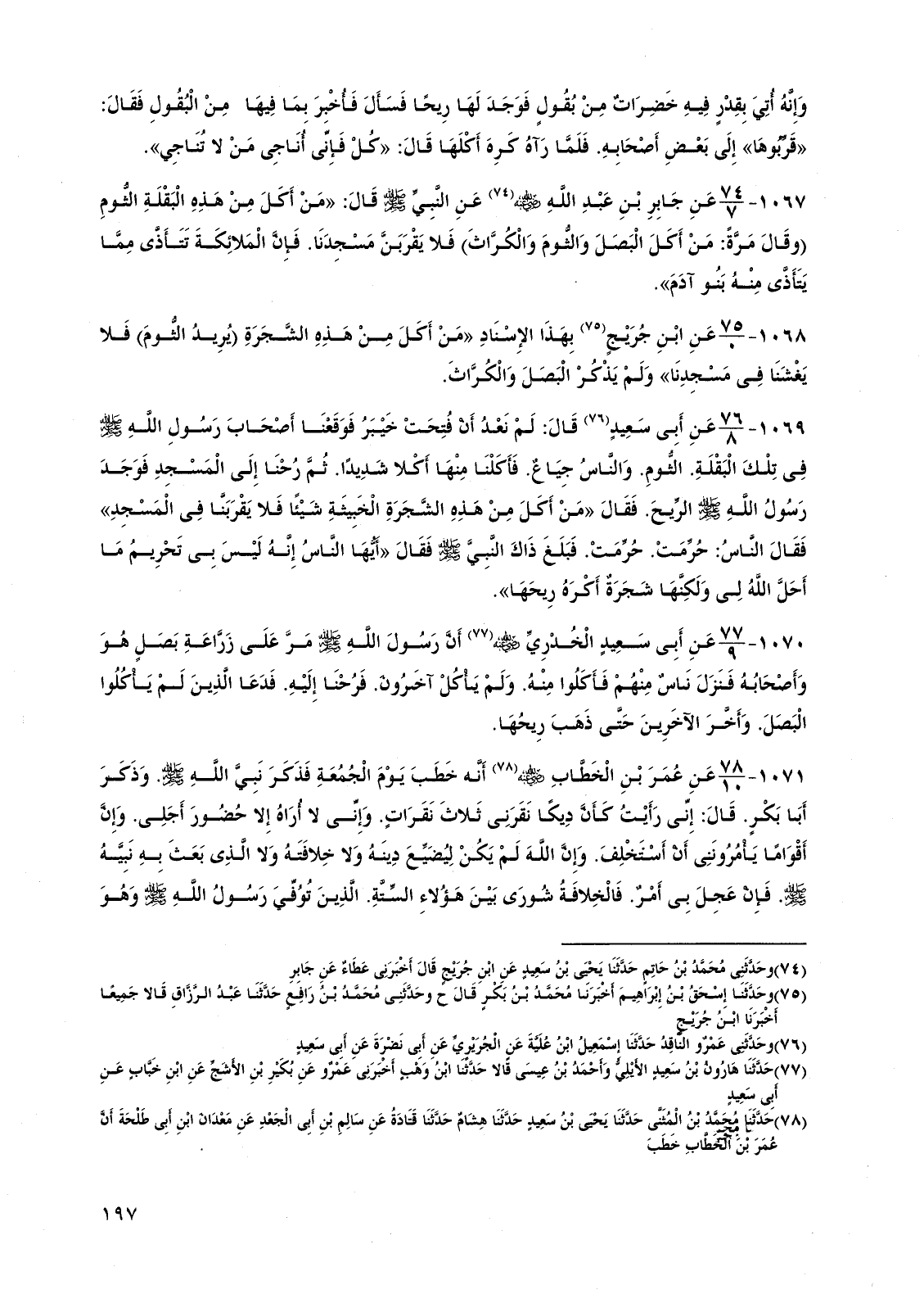 1070 - عن أبي سعيد الخدري رضي الله عنه أن رسول الله صلى الله عليه وسلم مر على زراعة بصل هو وأصحابه فنزل ناس منهم فأكلوا منه. ولم يأكل آخرون. فرحنا إليه. فدعا الذين لم يأكلوا البصل. وأخر الآخرين حتى ذهب ريحها.