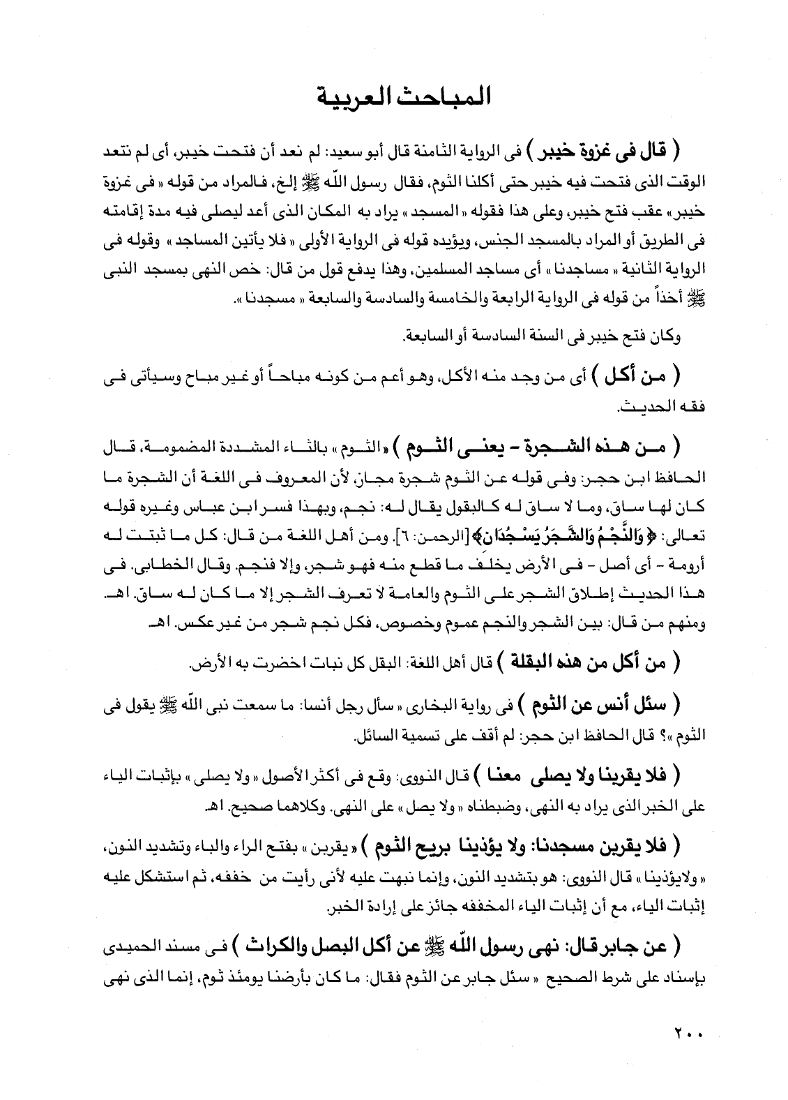 (من هذه الشجرة - يعني الثوم) "الثوم" بالثاء المشددة المضمومة، قال الحافظ ابن حجر: وفي قوله عن الثوم شجرة مجاز، لأن المعروف في اللغة أن الشجرة ما كان لها ساق، وما لا ساق له كالبقول يقال له: نجم، وبهذا فسر ابن عباس وغيره قوله تعالى: {والنجم والشجر يسجدان} [الرحمن: 6]. ومن أهل اللغة من قال: كل ما ثبتت له أرومة - أي أصل - في الأرض يخلف ما قطع منه فهو شجر، وإلا فنجم. وقال الخطابي. في هذا الحديث إطلاق الشجر على الثوم والعامة لا تعرف الشجر إلا ما كان له ساق. اهـ. ومنهم من قال: بين الشجر والنجم عموم وخصوص، فكل نجم شجر من غير عكس. اهـ.
