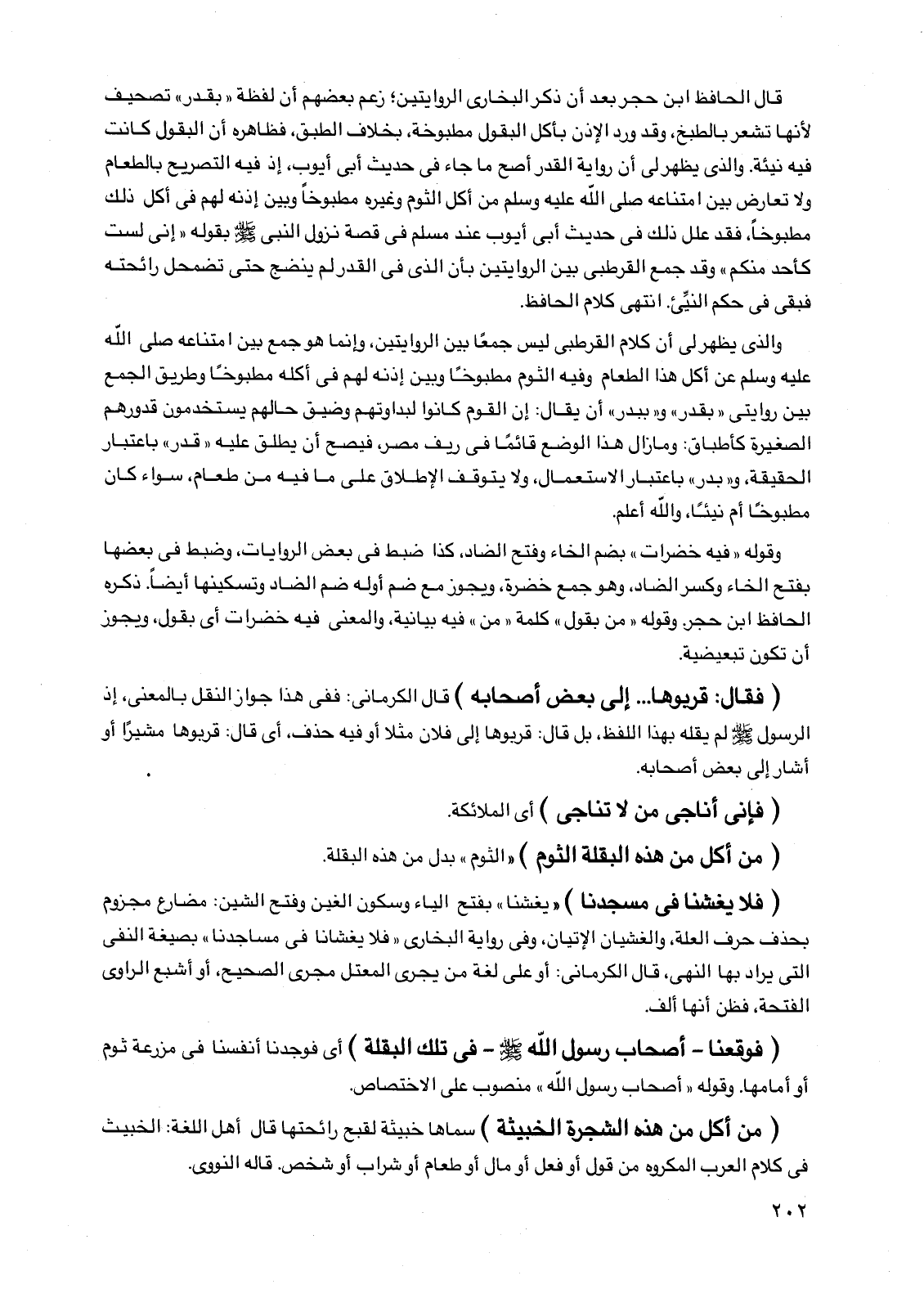 والذي يظهر لي أن كلام القرطبي ليس جمعاً بين الروايتين، وإنما هو جمع بين امتناعه صلى الله عليه وسلم عن أكل هذا الطعام وفيه الثوم مطبوخاً وبين إذنه لهم في أكله مطبوخاً وطريق الجمع بين روايتي "بقدر" و"ببدر" أن يقال: إن القوم كانوا لبداوتهم وضيق حالهم يستخدمون قدورهم الصغيرة كأطباق: ومازال هذا الوضع قائماً في ريف مصر، فيصح أن يطلق عليه "قدر" باعتبار الحقيقة، و"بدر" باعتبار الاستعمال، ولا يتوقف الإطلاق على ما فيه من طعام، سواء كان مطبوخاً أم نيئاً، والله أعلم.