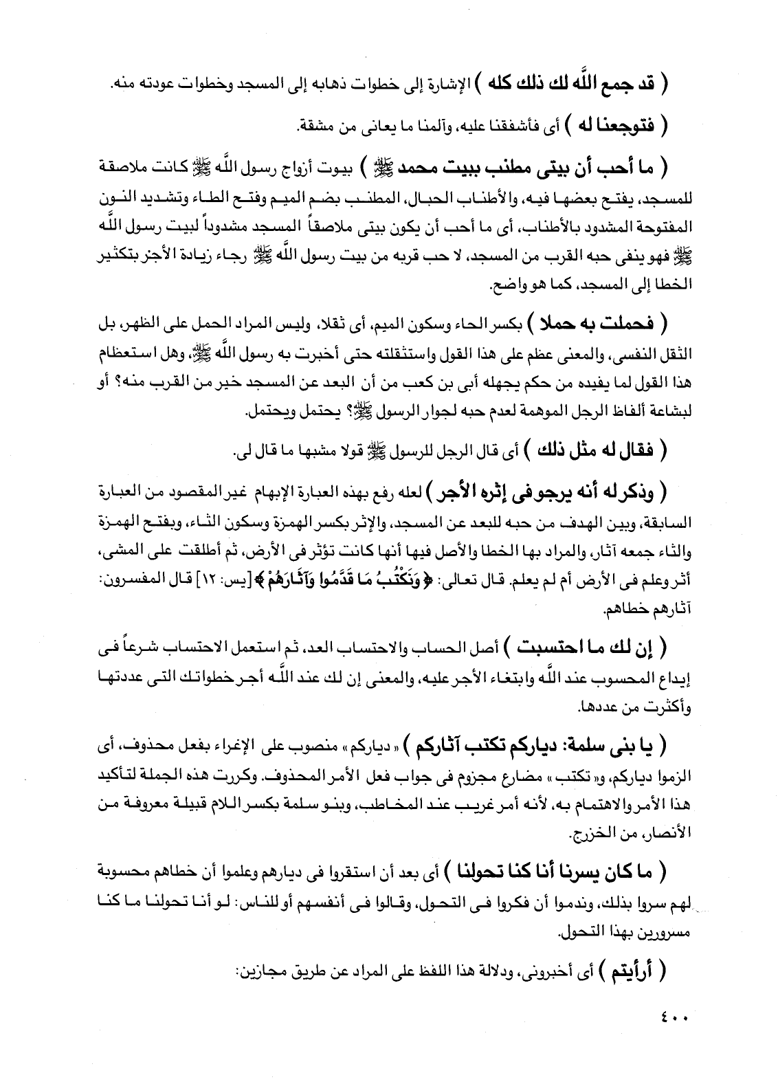 (فحملت به حملاً) بكسر الحاء وسكون الميم، أي ثقلاً، وليس المراد الحمل على الظهر، بل الثقل النفسي، والمعنى عظم على هذا القول واستثقلته حتى أخبرت به رسول اللَّه صلى الله عليه وسلم، وهل استعظام هذا القول لما يفيده من حكم يجهله أبي بن كعب من أن البعد عن المسجد خير من القرب منه؟ أو لبشاعة ألفاظ الرجل الموهمة لعدم حبه لجوار الرسول صلى الله عليه وسلم؟ يحتمل ويحتمل.