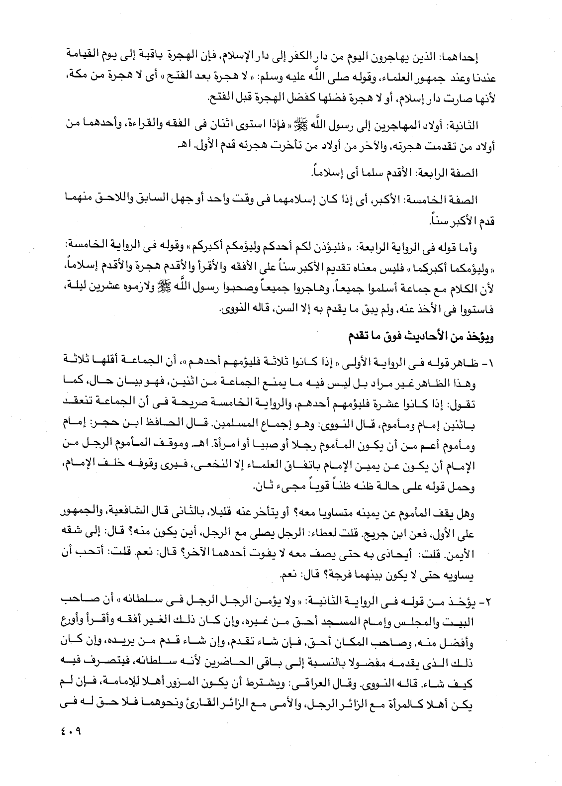 وأما قوله في الرواية الرابعة: "فليؤذن لكم أحدكم وليؤمكم أكبركم" وقوله في الرواية الخامسة: "وليؤمكما أكبركما" فليس معناه تقديم الأكبر سنًا على الأفقه والأقرأ والأقدم هجرة والأقدم إسلامًا، لأن الكلام مع جماعة أسلموا جميعًا، وهاجروا جميعًا وصحبوا رسول الله صلى الله عليه وسلم ولازموه عشرين ليلة، فاستووا في الأخذ عنه، ولم يبق ما يقدم به إلا السن، قاله النووي.