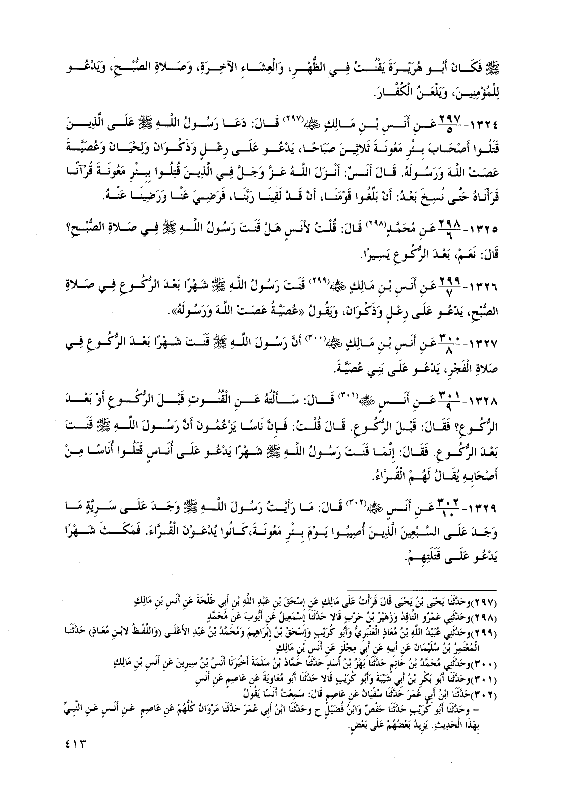 1324 - عن أنس بن مالك رضي الله عنه قال: دعا رسول الله صلى الله عليه وسلم على الذين قتلوا أصحاب بئر معونة ثلاثين صباحًا، يدعو على رعل وذكوان ولحيان وعصية عصت الله ورسوله. قال أنس: أنزل الله عز وجل في الذين قتلوا ببئر معونة قرآنًا قرأناه حتى نسخ بعد: أن بلغوا قومنا، أن قد لقينا ربنا، فرضي عنا ورضينا عنه.