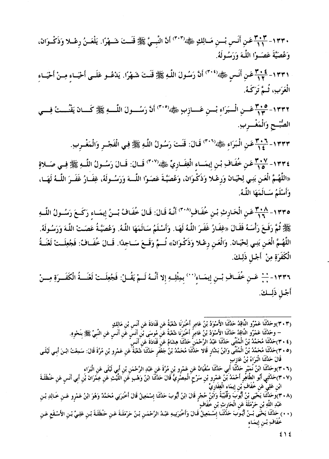 1330 - عن أنس بن مالك رضي الله عنه أن النبي صلى الله عليه وسلم قنت شهرًا. يلعن رعلاً وذكوان، وعصية عصوا الله ورسوله.