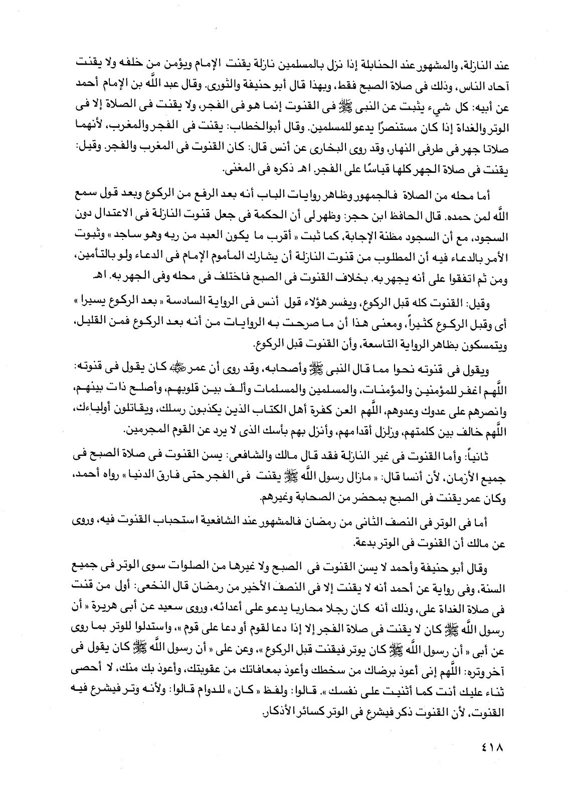 وقال أبو حنيفة وأحمد لا يسن القنوت في الصبح ولا غيرها من الصلوات سوى الوتر في جميع السنة، وفي رواية عن أحمد أنه لا يقنت إلا في النصف الأخير من رمضان قال النخعي: أول من قنت في صلاة الغداة علي، وذلك أنه كان رجلاً محاربًا يدعو على أعدائه، وروى سعيد عن أبي هريرة "أن رسول الله صلى الله عليه وسلم كان لا يقنت في صلاة الفجر إلا إذا دعا لقوم أو دعا على قوم"، واستدلوا للوتر بما روي عن أبي "أن رسول الله صلى الله عليه وسلم كان يوتر فيقنت قبل الركوع"، وعن علي "أن رسول الله صلى الله عليه وسلم كان يقول في آخر وتره: اللهم إني أعوذ برضاك من سخطك وأعوذ بمعافاتك من عقوبتك، وأعوذ بك منك، لا أحصي ثناء عليك أنت كما أثنيت على نفسك". قالوا: ولفظ "كان" للدوام قالوا: ولأنه وتر فيشرع فيه القنوت، لأن القنوت ذكر فيشرع في الوتر كسائر الأذكار.