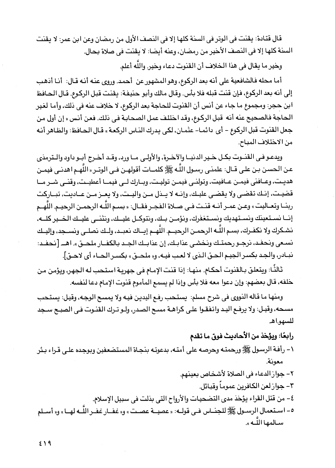 ثالثًا: ويتعلق بالقنوت أحكام. منها: إذا قنت الإمام في جهرية استحب له الجهر، ويؤمن من خلفه، قال بعضهم: وإن دعوا معه فلا بأس وإذا لم يسمع المأموم قنوت الإمام دعا لنفسه.