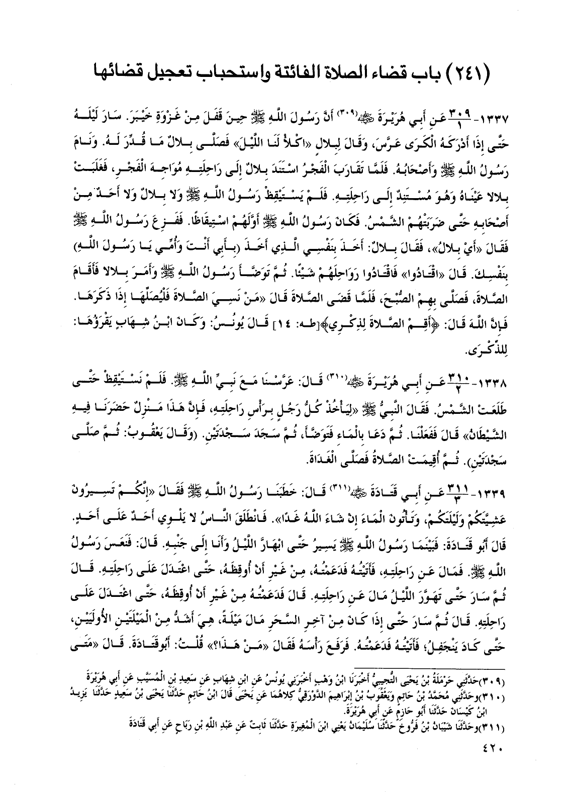 1337 - عن أبي هريرة رضي الله عنه أن رسول الله صلى الله عليه وسلم حين قفل من غزوة خيبر. سار ليله حتى إذا أدركه الكرى عرس، وقال لبلال "اكلأ لنا الليل" فصلى بلال ما قدر له. ونام رسول الله صلى الله عليه وسلم وأصحابه. فلما تقارب الفجر استند بلال إلى راحلته مواجه الفجر، فغلبت بلالاً عيناه وهو مستند إلى راحلته. فلم يستيقظ رسول الله صلى الله عليه وسلم ولا بلال ولا أحد من أصحابه حتى ضربتهم الشمس. فكان رسول الله صلى الله عليه وسلم أولهم استيقاظًا. ففزع رسول الله صلى الله عليه وسلم فقال "أي بلال" فقال بلال: أخذ بنفسي الذي أخذ (بأبي أنت وأمي يا رسول الله) بنفسك. قال: "اقتادوا" فاقتادوا رواحلهم شيئًا. ثم توضأ رسول الله صلى الله عليه وسلم وأمر بلالاً فأقام الصلاة، فصلى بهم الصبح، فلما قضى الصلاة قال "من نسي الصلاة فليصلها إذا ذكرها. فإن الله قال: {أقم الصلاة لذكري} [طه: 14] قال يونس: وكان ابن شهاب يقرؤها: للذكرى.