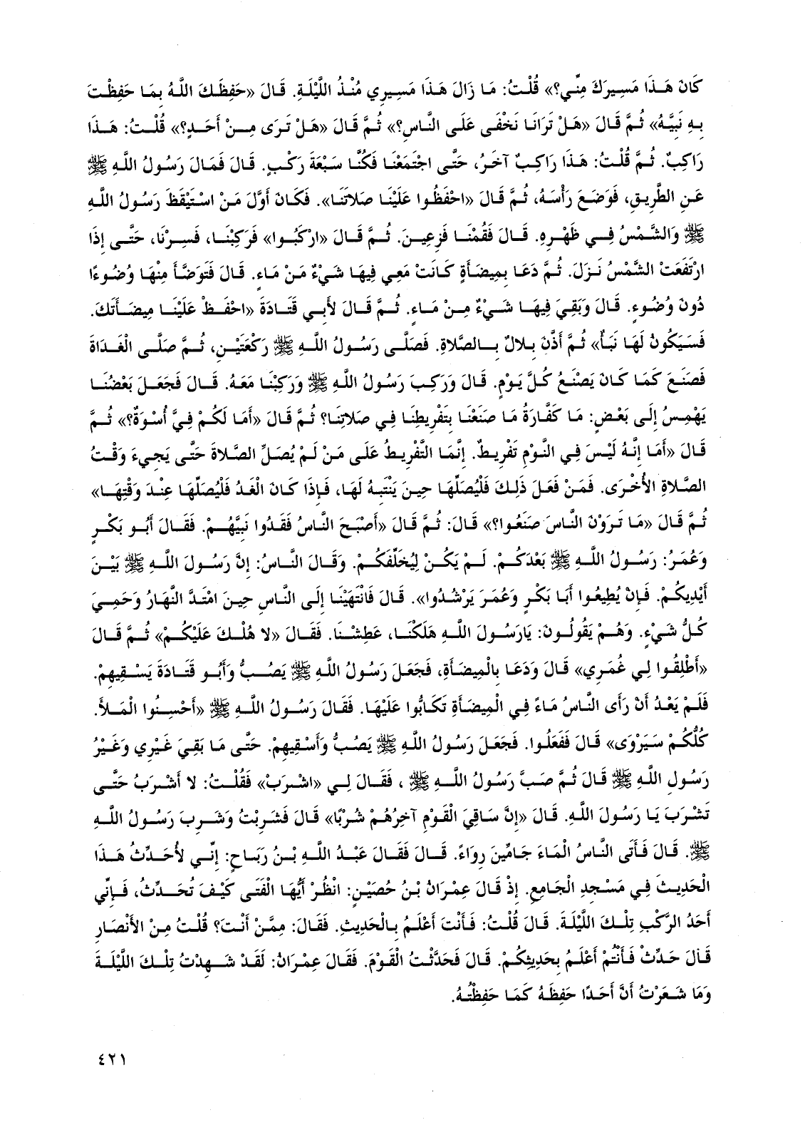فمن فعل ذلك فليصلها حين ينتبه لها، فإذا كان الغد فليصلها عند وقتها" ثم قال "ما ترون الناس صنعوا؟ " قال: ثم قال "أصبح الناس فقدوا نبيهم. فقال أبو بكر وعمر: رسول الله صلى الله عليه وسلم بعدكم. لم يكن ليخلفكم. وقال الناس: إن رسول الله صلى الله عليه وسلم بين أيديكم. فإن يطيعوا أبا بكر وعمر يرشدوا". قال فانتهينا إلى الناس حين امتد النهار وحمي كل شيء. وهم يقولون: يا رسول الله هلكنا، عطشنا. فقال "لا هلك عليكم" ثم قال "أطلقوا لي غمري" قال ودعا بالميضأة، فجعل رسول الله صلى الله عليه وسلم يصب وأبو قتادة يسقيهم. فلم يعد أن رأى الناس ماء في الميضأة تكابوا عليها. فقال رسول الله صلى الله عليه وسلم "أحسنوا الملأ. كلكم سيروى" قال ففعلوا. فجعل رسول الله صلى الله عليه وسلم يصب وأسقيهم. حتى ما بقي غيري وغير رسول الله صلى الله عليه وسلم قال ثم صب رسول الله صلى الله عليه وسلم، فقال لي "اشرب" فقلت: لا أشرب حتى تشرب يا رسول الله. قال "إن ساقي القوم آخرهم شربًا" قال فشربت وشرب رسول الله صلى الله عليه وسلم. قال فأتى الناس الماء جامين رواء. قال فقال عبد الله بن رباح: إني لأحدث هذا الحديث في مسجد الجامع. إذ قال عمران بن حصين: انظر أيها الفتى كيف تحدث، فإني أحد الركب تلك الليلة. قال قلت: فأنت أعلم بالحديث. فقال: ممن أنت؟ قلت من الأنصار قال حدث فأنتم أعلم بحديثكم. قال فحدثت القوم. فقال عمران: لقد شهدت تلك الليلة وما شعرت أن أحدًا حفظه كما حفظته.