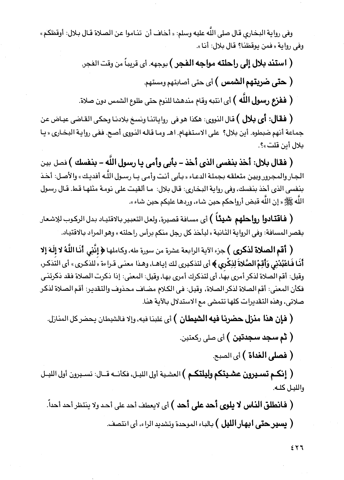 (فقال بلال: أخذ بنفسي الذي أخذ - بأبي وأمي يا رسول اللَّه - بنفسك) فصل بين الجار والمجرور وبين متعلقه بجملة الدعاء "بأبي أنت وأمي يا رسول الله أفديك" والأصل: أخذ بنفسي الذي أخذ بنفسك، وفي رواية البخاري: قال بلال: ما ألقيت على نومة مثلها قط. قال رسول الله صلى الله عليه وسلم "إن الله قبض أرواحكم حين شاء، وردها عليكم حين شاء".