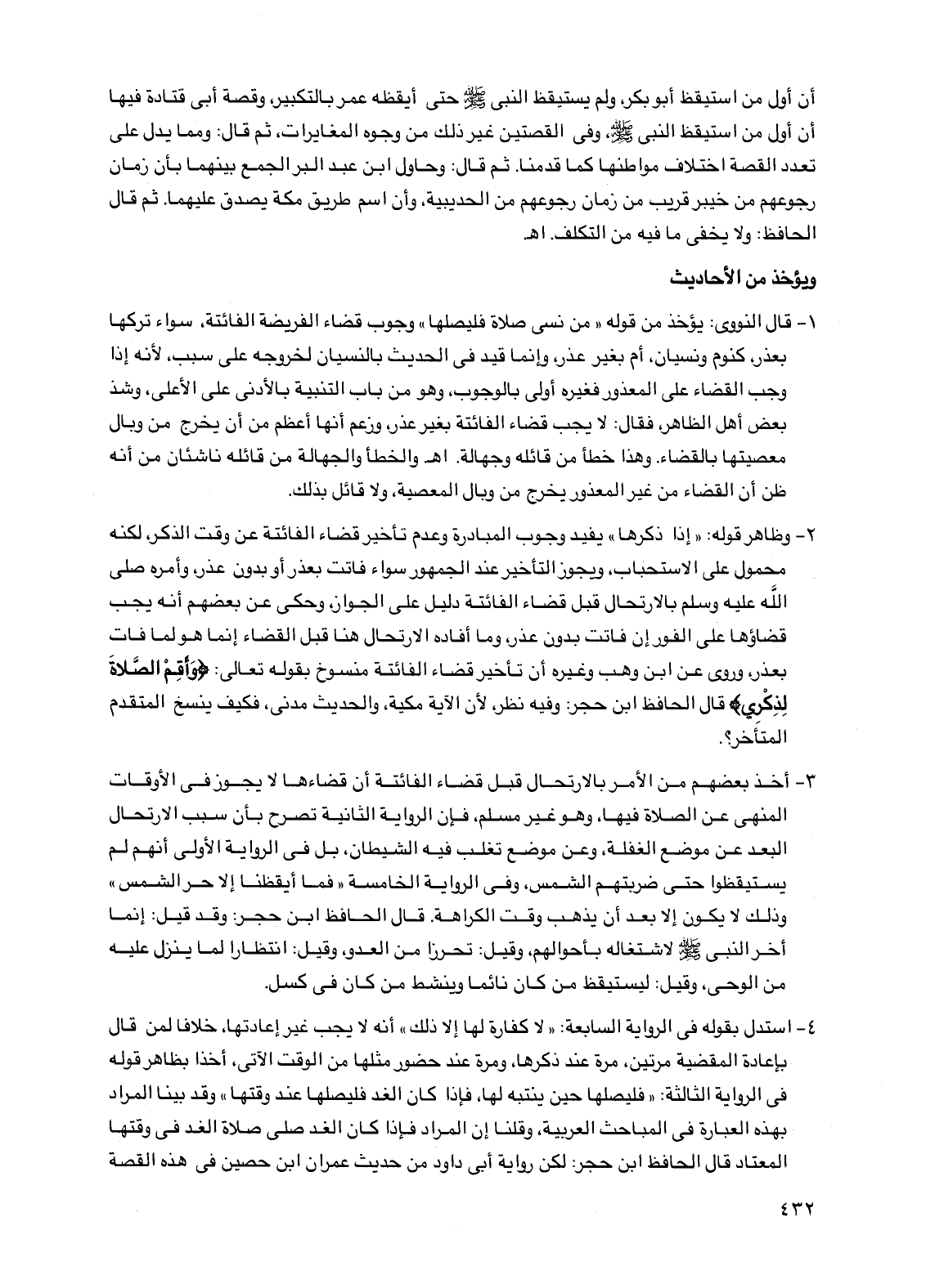 4 - استدل بقوله في الرواية السابعة: "لا كفارة لها إلا ذلك" أنه لا يجب غير إعادتها، خلافًا لمن قال بإعادة المقضية مرتين، مرة عند ذكرها، ومرة عند حضور مثلها من الوقت الآتي، أخذًا بظاهر قوله في الرواية الثالثة: "فليصلها حين ينتبه لها، فإذا كان الغد فليصلها عند وقتها" وقد بينا المراد بهذه العبارة في المباحث العربية، وقلنا إن المراد فإذا كان الغد صلى صلاة الغد في وقتها المعتاد قال الحافظ ابن حجر: لكن رواية أبي داود من حديث عمران بن حصين في هذه القصة