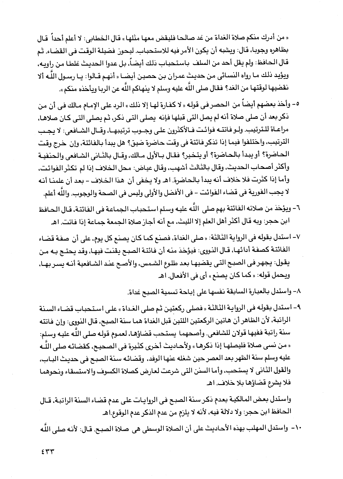 "من أدرك منكم صلاة الغداة من غد صالحًا فليقض معها مثلها" قال الخطابي: لا أعلم أحدًا قال بظاهره وجوبًا، قال: ويشبه أن يكون الأمر فيه للاستحباب. ليحوز فضيلة الوقت في القضاء. ثم قال الحافظ: ولم يقل أحد من السلف باستحباب ذلك أيضًا، بل عدوا الحديث غلطًا من راويه، ويؤيد ذلك ما رواه النسائي من حديث عمران بن حصين أيضًا "أنهم قالوا: يا رسول الله ألا نقضيها لوقتها من الغد؟ فقال صلى الله عليه وسلم لا ينهاكم الله عن الربا ويأخذه منكم".