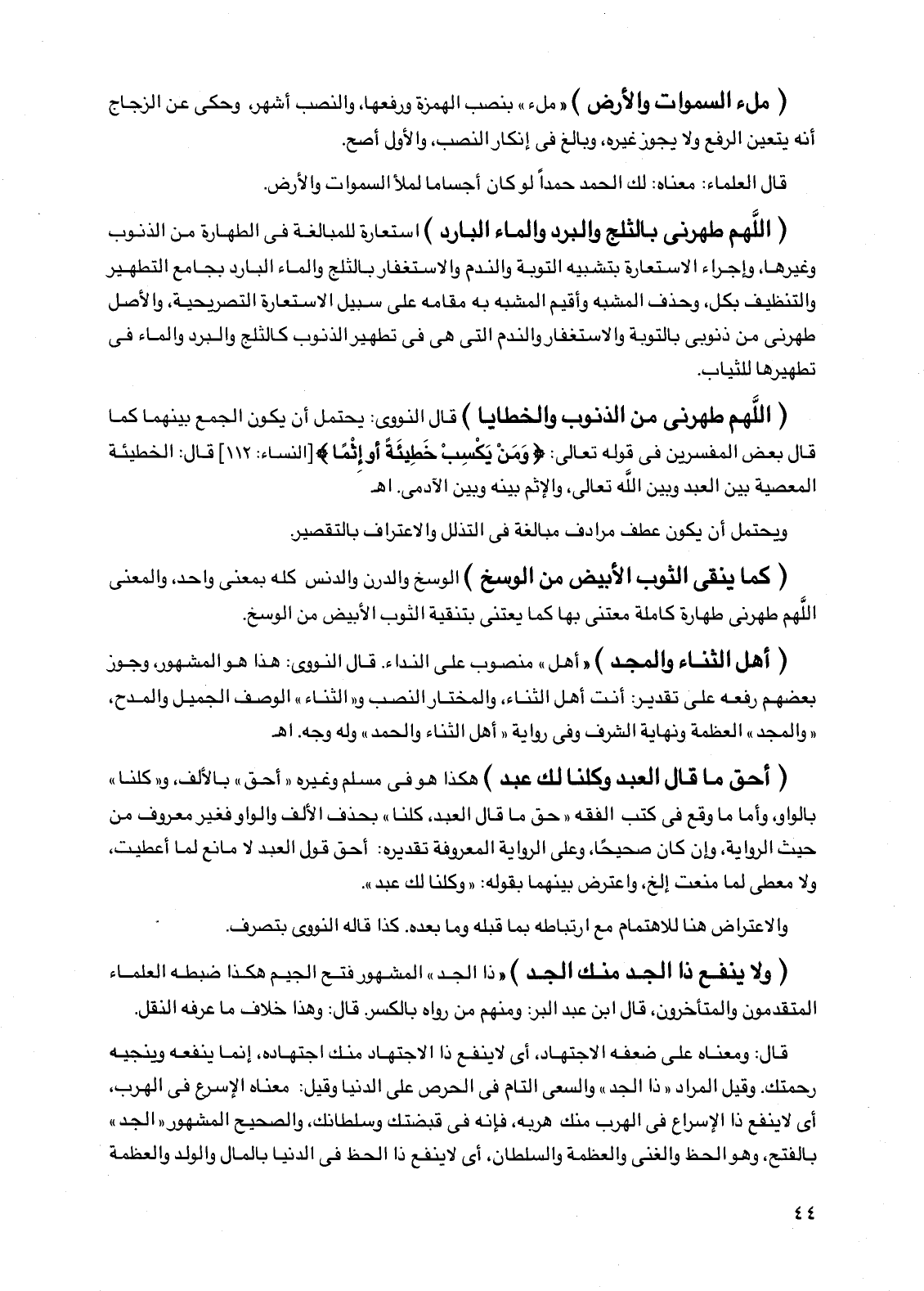 (أهل الثناء والمجد) "أهل" منصوب على النداء، قال النووي: هذا هو المشهور، وجوز بعضهم رفعه على تقدير: أنت أهل الثناء، والمختار النصب والثناء الوصف الجميل والمدح، والمجد العظمة ونهاية الشرف وفي رواية أهل الثناء والحمد وله وجه اهـ
