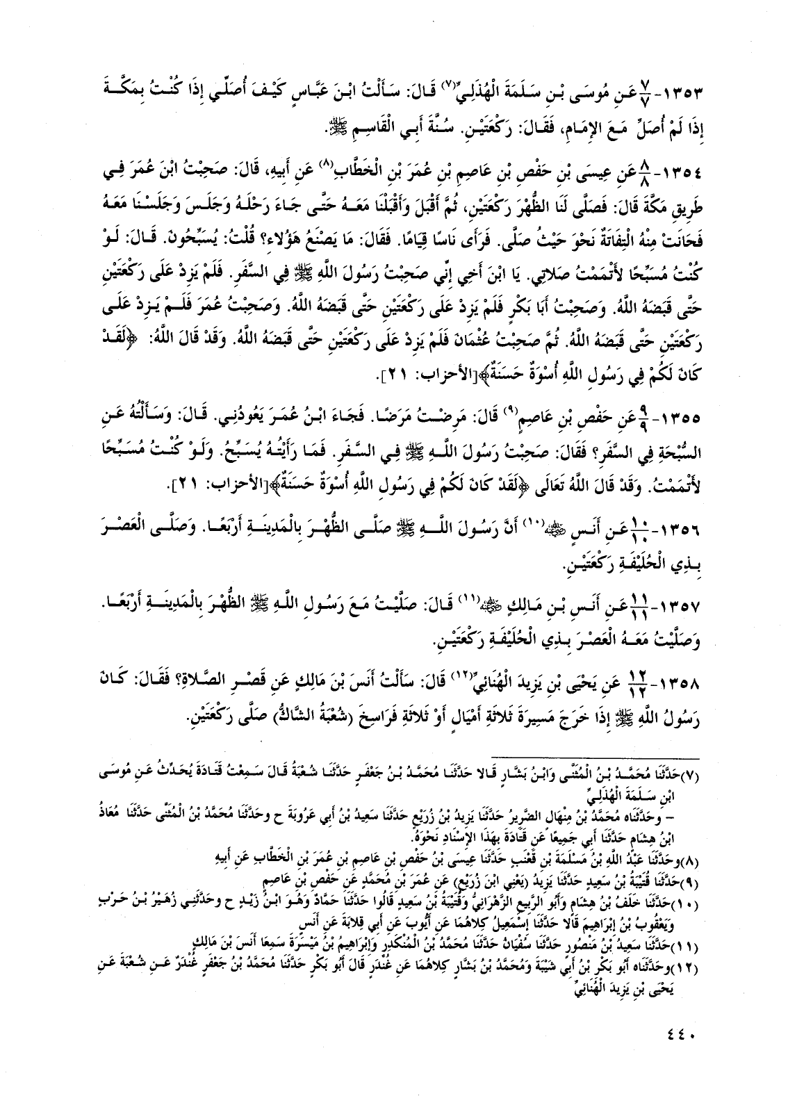 1354 - عن عيسى بن حفص بن عاصم بن عمر بن الخطاب عن أبيه، قال: صحبت ابن عمر في طريق مكة قال: فصلى لنا الظهر ركعتين، ثم أقبل وأقبلنا معه حتى جاء رحله وجلس وجلسنا معه فحانت منه التفاتة نحو حيث صلى. فرأى ناسًا قيامًا. فقال: ما يصنع هؤلاء؟ قلت: يسبحون. قال: لو كنت مسبحًا لأتممت صلاتي. يا ابن أخي إني صحبت رسول الله صلى الله عليه وسلم في السفر. فلم يزد على ركعتين حتى قبضه الله. وصحبت أبا بكر فلم يزد على ركعتين حتى قبضه الله. وصحبت عمر فلم يزد على ركعتين حتى قبضه الله. ثم صحبت عثمان فلم يزد على ركعتين حتى قبضه الله. وقد قال الله: {لقد كان لكم في رسول الله أسوة حسنة} [الأحزاب: 21].