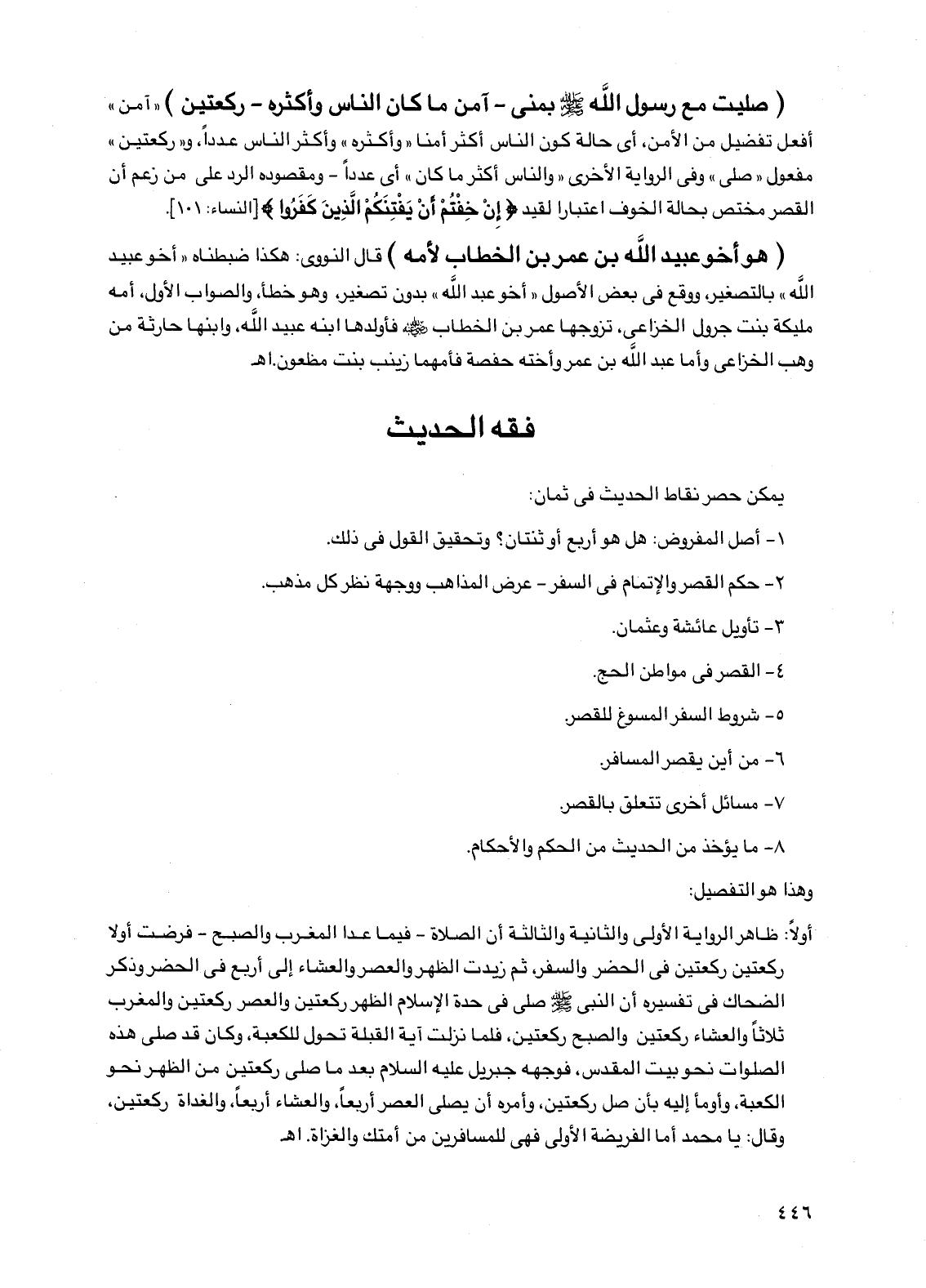 (صليت مع رسول الله صلى الله عليه وسلم بمنى - آمن ما كان الناس وأكثره - ركعتين) "آمن" أفعل تفضيل من الأمن، أي حالة كون الناس أكثر أمنًا "وأكثره" وأكثر الناس عددًا، و"ركعتين" مفعول "صلى" وفي الرواية الأخرى "والناس أكثر ما كان" أي عددًا - ومقصوده الرد على من زعم أن القصر مختص بحالة الخوف اعتبارًا لقيد {إن خفتم أن يفتنكم الذين كفروا} [النساء: 101].