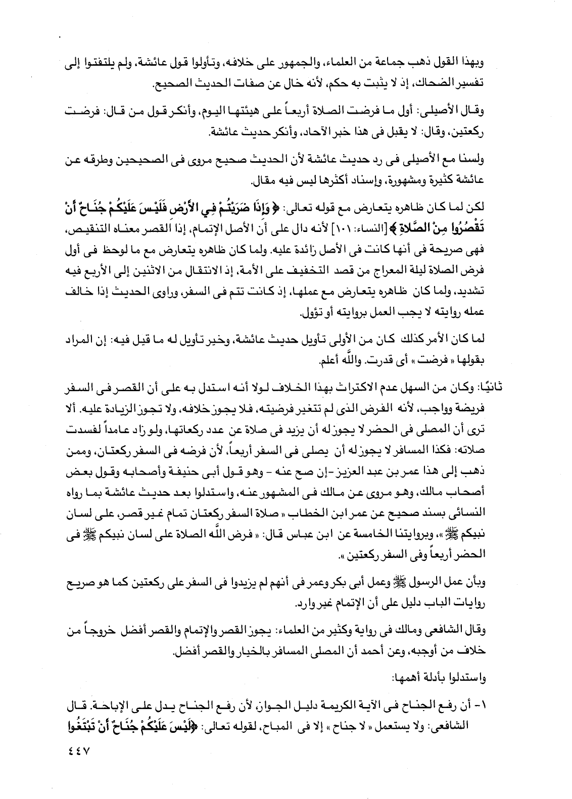 ثانياً: وكان من السهل عدم الاكتراث بهذا الخلاف لولا أنه استدل به على أن القصر في السفر فريضة وواجب، لأنه الفرض الذي لم تتغير فرضيته، فلا يجوز خلافه، ولا تجوز الزيادة عليه. ألا ترى أن المصلي في الحضر لا يجوز له أن يزيد في صلاة عن عدد ركعاتها، ولو زاد عامداً لفسدت صلاته: فكذا المسافر لا يجوز له أن يصلي في السفر أربعاً، لأن فرضه في السفر ركعتان، وممن ذهب إلى هذا عمر بن عبد العزيز -إن صح عنه- وهو قول أبي حنيفة وأصحابه وقول بعض أصحاب مالك، وهو مروي عن مالك في المشهور عنه، واستدلوا بعد حديث عائشة بما رواه النسائي بسند صحيح عن عمر بن الخطاب "صلاة السفر ركعتان تمام غير قصر، على لسان نبيكم صلى الله عليه وسلم"، وبروايتنا الخامسة عن ابن عباس قال: "فرض الله الصلاة على لسان نبيكم صلى الله عليه وسلم في الحضر أربعاً وفي السفر ركعتين".
