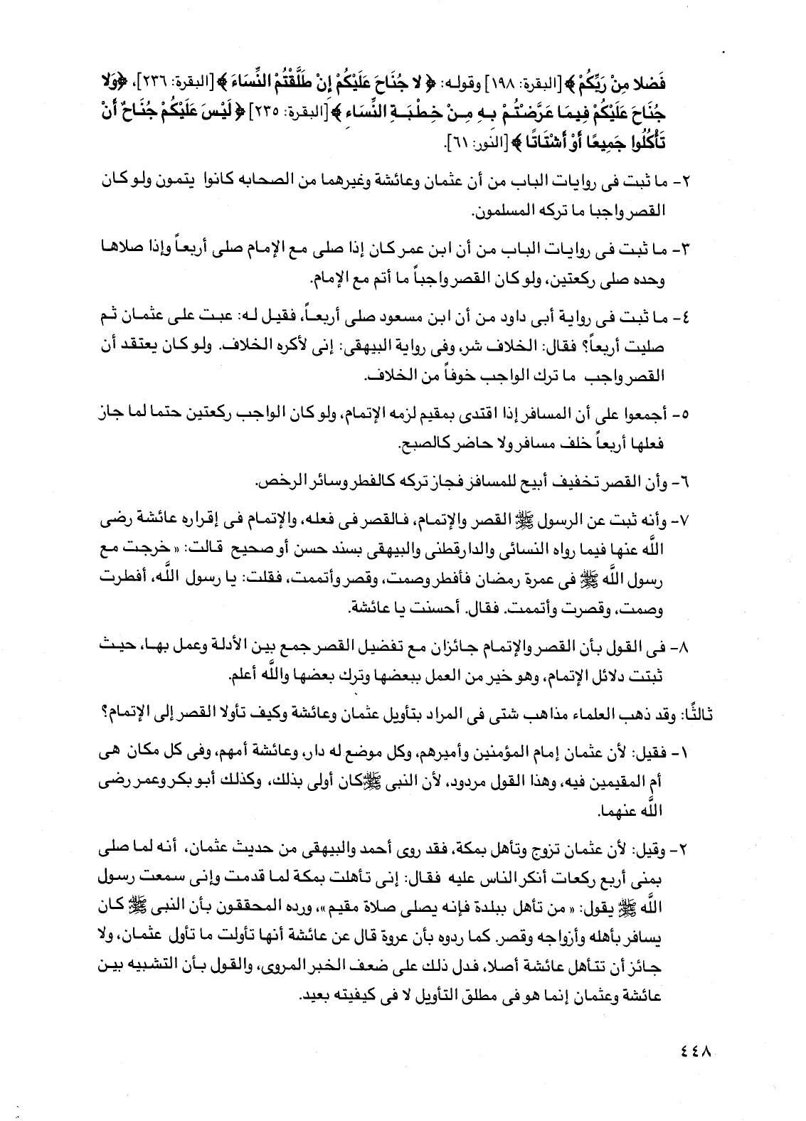 7 - وأنه ثبت عن الرسول صلى الله عليه وسلم القصر والإتمام، فالقصر في فعله، والإتمام في إقراره عائشة رضي الله عنها فيما رواه النسائي والدارقطني والبيهقي بسند حسن أو صحيح قالت: "خرجت مع رسول الله صلى الله عليه وسلم في عمرة رمضان فأفطر وصمت، وقصر وأتممت، فقلت: يا رسول الله، أفطرت وصمت، وقصرت وأتممت. فقال: أحسنت يا عائشة.