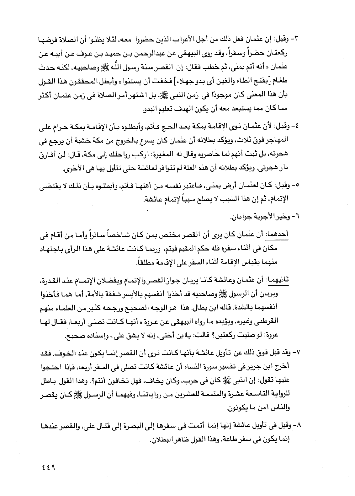4 - وقيل: لأن عثمان نوى الإقامة بمكة بعد الحج فأتم، وأبطلوه بأن الإقامة بمكة حرام على المهاجر فوق ثلاث، ويؤكد بطلانه أن عثمان كان يسرع بالخروج من مكة خشية أن يرجع في هجرته، بل ثبت أنهم لما حاصروه وقال له المغيرة: اركب رواحلك إلى مكة، قال: لن أفارق دار هجرتي. ويؤكد بطلانه أن هذه العلة لم تتوافر لعائشة حتى تتأول بها هي الأخرى.