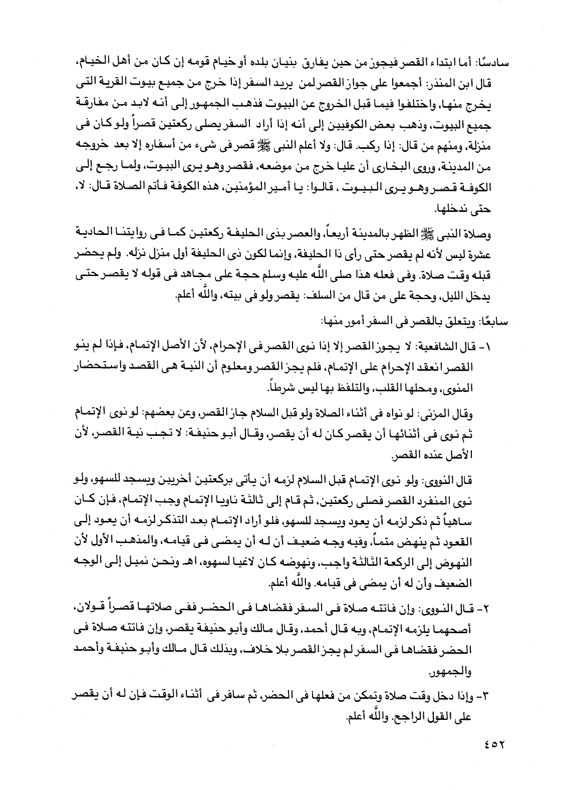 سادساً: أما ابتداء القصر فيجوز من حين يفارق بنيان بلده أو خيام قومه إن كان من أهل الخيام، قال ابن المنذر: أجمعوا على جواز القصر لمن يريد السفر إذا خرج من جميع بيوت القرية التي يخرج منها، واختلفوا فيما قبل الخروج عن البيوت فذهب الجمهور إلى أنه لا بد من مفارقة جميع البيوت، وذهب بعض الكوفيين إلى أنه إذا أراد السفر يصلي ركعتين قصراً ولو كان في منزلة، ومنهم من قال: إذا ركب. قال: ولا أعلم النبي صلى الله عليه وسلم قصر في شيء من أسفاره إلا بعد خروجه من المدينة، وروى البخاري أن علياً خرج من موضعه، فقصر وهو يرى البيوت، ولما رجع إلى الكوفة قصر وهو يرى البيوت، قالوا: يا أمير المؤمنين، هذه الكوفة فأتم الصلاة قال: لا، حتى ندخلها.