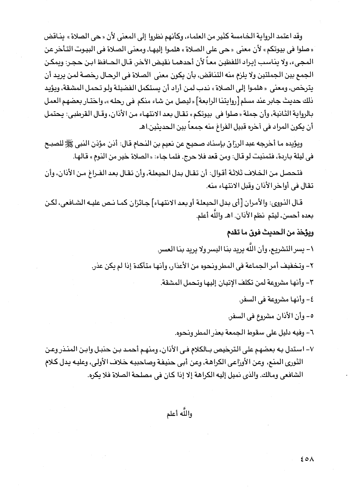 وقد اعتمد الرواية الخامسة كثير من العلماء، وكأنهم نظروا إلى المعنى لأن "حي الصلاة" يناقض "صلوا في بيوتكم" لأن معنى "حي على الصلاة" هلموا إليها ومعنى الصلاة في البيوت التأخر عن المجيء، ولا يناسب إيراد اللفظين معًا لأن أحدهما نقيض الآخر. قال الحافظ ابن حجر: ويمكن الجمع بين الجملتين ولا يلزم منه التناقض، بأن يكون معنى الصلاة في الرحال رخصة لمن يريد أن يترخص، ومعنى "هلموا إلى الصلاة" ندب لمن أراد أن يستكمل الفضيلة ولو تحمل المشقة، ويؤيد ذلك حديث جابر عند مسلم [روايتنا الرابعة] "ليصل من شاء منكم في رحله"، واختار بعضهم العمل بالرواية الثانية، وأن جملة "صلوا في بيوتكم" تقال بعد الانتهاء من الأذان، وقال القرطبي: يحتمل أن يكون المراد في آخره قبيل الفراغ منه جمعًا بين الحديثين. اهـ.