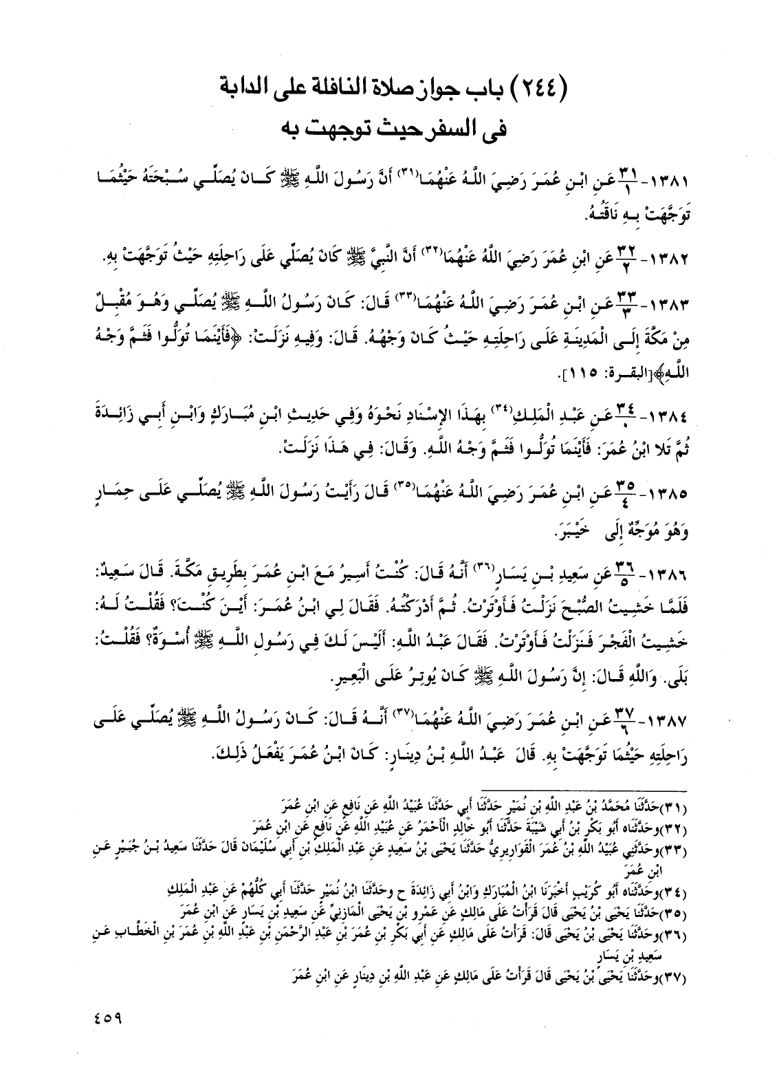 1387 - عن ابن عمر رضي الله عنهما أنه قال: كان رسول الله صلى الله عليه وسلم يصلي على راحلته حيثما توجهت به. قال عبد الله بن دينار: كان ابن عمر يفعل ذلك.