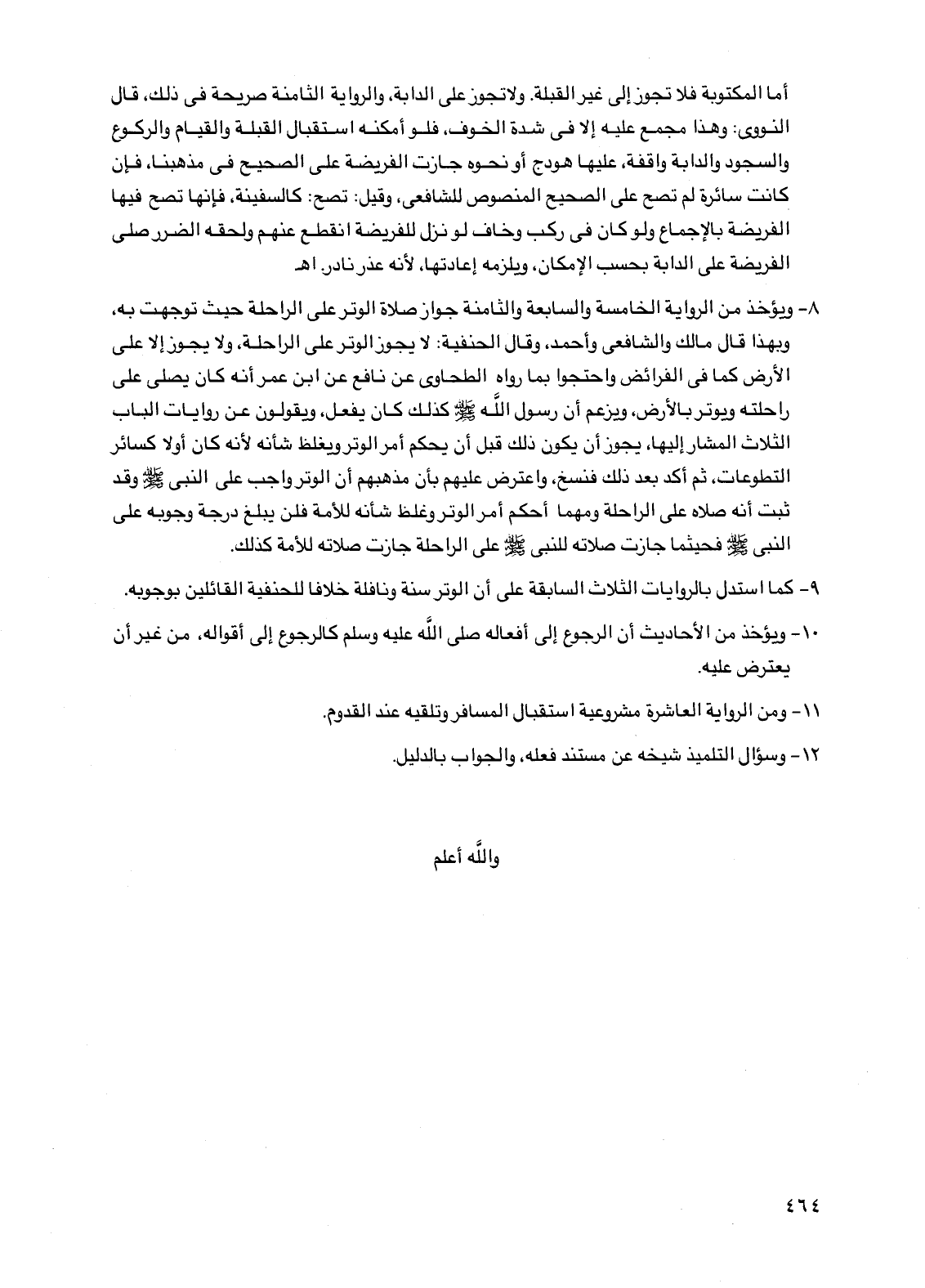 8 - ويوخذ من الرواية الخامسة والسابعة والثامنة جواز صلاة الوتر على الراحلة حيث توجهت به، وبهذا قال مالك والشافعي وأحمد، وقال الحنفية: لا يجوز الوتر على الراحلة، ولا يجوز إلا على الأرض كما في الفرائض واحتجوا بما رواه الطحاوي عن نافع عن ابن عمر أنه كان يصلي على راحلته ويوتر بالأرض، ويزعم أن رسول اللَّه صلى الله عليه وسلم كذلك كان يفعل، ويقولون عن روايات الباب الثلاث المشار إليها، يجوز أن يكون ذلك قبل أن يحكم أمر الوتر ويغلظ شأنه لأنه كان أولاً كسائر التطوعات، ثم أكد بعد ذلك فنسخ، واعترض عليهم بأن مذهبهم أن الوتر واجب على النبي صلى الله عليه وسلم وقد ثبت أنه صلاه على الراحلة ومهما أحكم أمر الوتر وغلظ شأنه للأمة فلن يبلغ درجة وجوبه على النبي صلى الله عليه وسلم فحيثما جازت صلاته للنبي صلى الله عليه وسلم على الراحلة جازت صلاته للأمة كذلك.