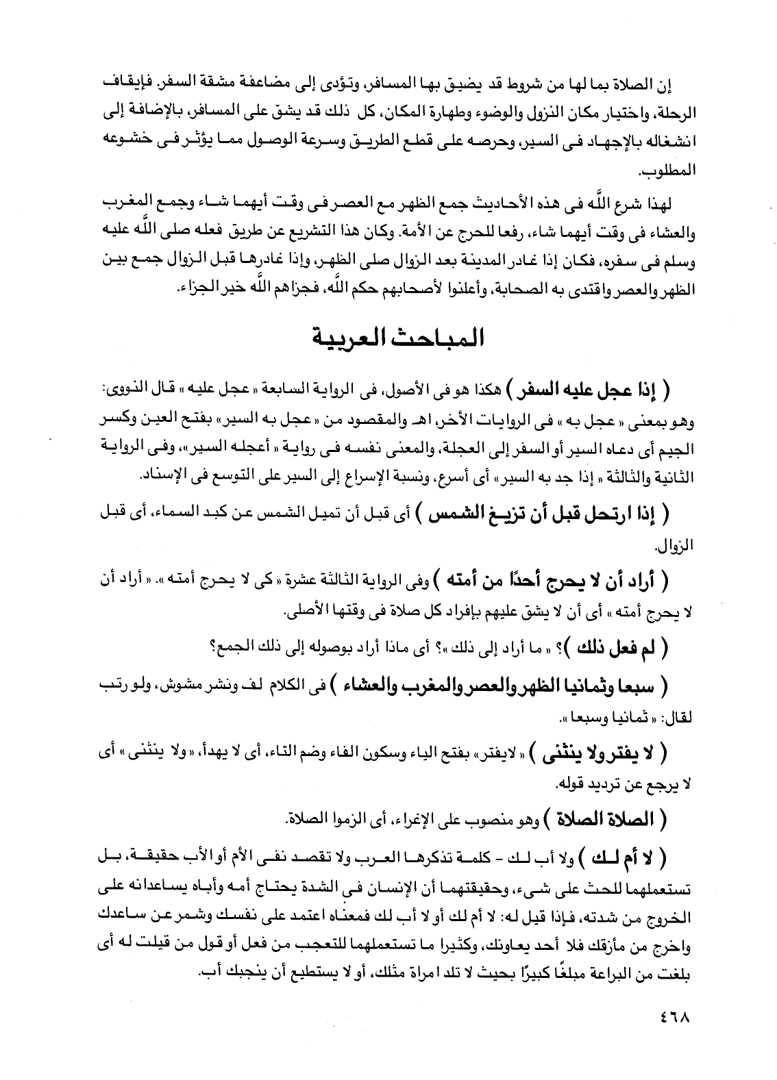 لهذا شرع اللَّه في هذه الأحاديث جمع الظهر مع العصر في وقت أيهما شاء وجمع المغرب والعشاء في وقت أيهما شاء، رفعًا للحرج عن الأمة. وكان هذا التشريع عن طريق فعله صلى اللَّه عليه وسلم في سفره، فكان إذا غادر المدينة بعد الزوال صلى الظهر، وإذا غادرها قبل الزوال جمع بين الظهر والعصر واقتدى به الصحابة، وأعلنوا لأصحابهم حكم اللَّه، فجزاهم اللَّه خير الجزاء.