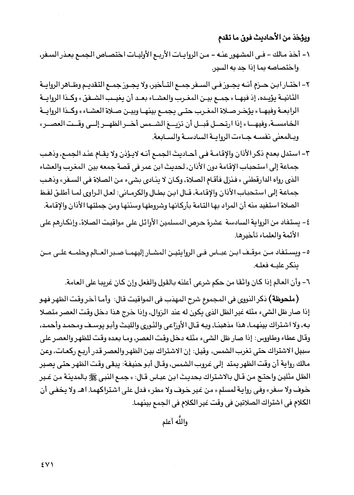 (ملحوظة) ذكر النووي في المجموع شرح المهذب في المواقيت قال: وأما آخر وقت الظهر فهو إذا صار ظل الشيء مثله غير الظل الذي يكون له عند الزوال، وإذا خرج هذا دخل وقت العصر متصلاً به، ولا اشتراك بينهما، هذا مذهبنا، وبه قال الأوزاعي والثوري والليث وأبو يوسف ومحمد وأحمد، وقال عطاء وطاووس، إذا صار ظل الشيء مثله دخل وقت العصر، وما بعده وقت للظهر والعصر على سبيل الاشتراك حتى تغرب الشمس، وقيل: إن الاشتراك بين الظهر والعصر قدر أربع ركعات، وعن مالك رواية أن وقت الظهر يمتد إلى غروب الشمس، وقال أبو حنيفة: يبقى وقت الظهر حتى يصير الظل مثلين واحتج من قال بالاشتراك بحديث ابن عباس قال: "جمع النبي صلى الله عليه وسلم بالمدينة من غير خوف ولا سفر" وفي رواية لمسلم "من غير خوف ولا مطر" فدل على اشتراكهما. اهـ. ولا يخفى أن الكلام في اشتراك الصلاتين في وقت غير الكلام في الجمع بينهما.