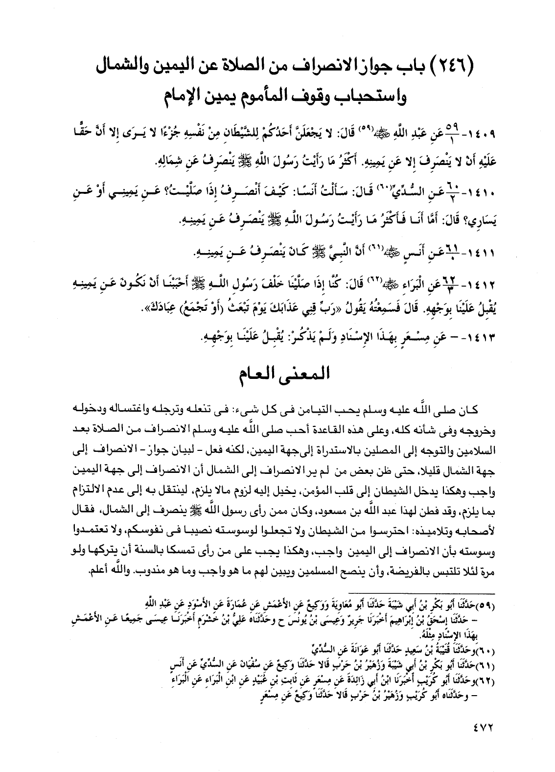 1410 - عن السدي قال: سألت أنسًا: كيف أنصرف إذا صليت؟ عن يميني أو عن يساري؟ قال: أما أنا فأكثر ما رأيت رسول الله صلى الله عليه وسلم ينصرف عن يمينه.