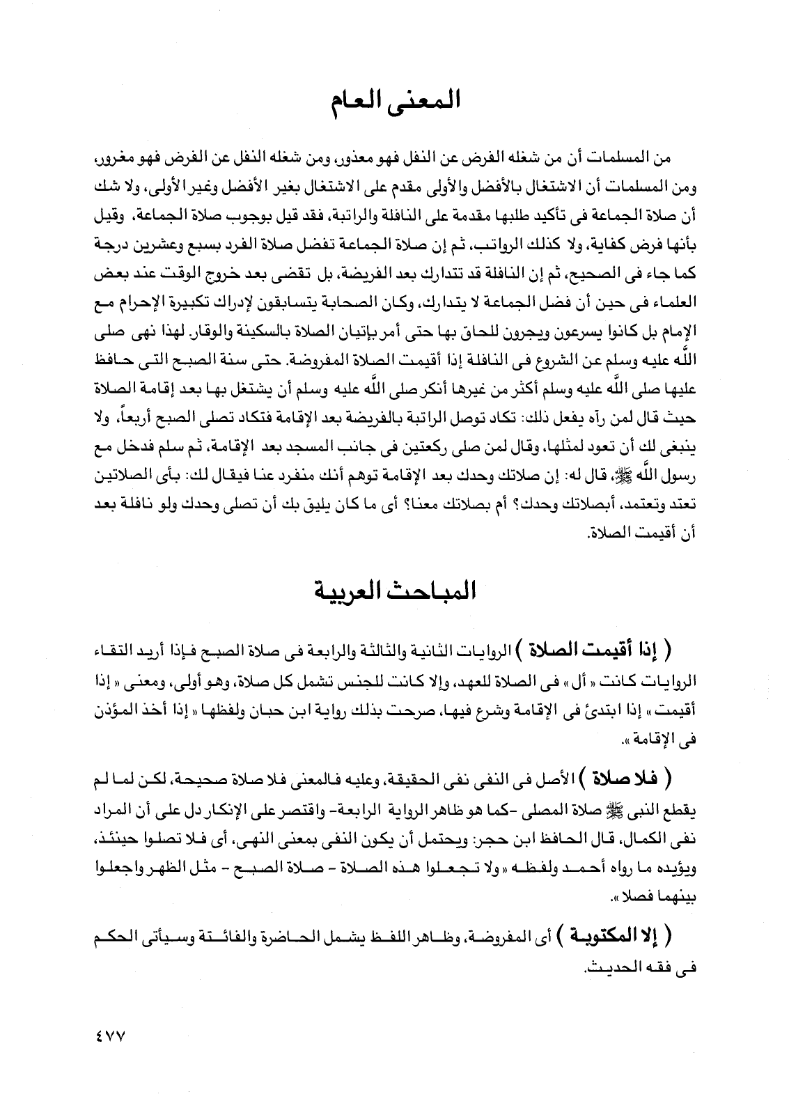 من المسلمات أن من شغله الفرض عن النفل فهو معذور، ومن شغله النفل عن الفرض فهو مغرور، ومن المسلمات أن الاشتغال بالأفضل والأولى مقدم على الاشتغال بغير الأفضل وغير الأولى، ولا شك أن صلاة الجماعة في تأكيد طلبها مقدمة على النافلة والراتبة، فقد قيل بوجوب صلاة الجماعة، وقيل بأنها فرض كفاية، ولا كذلك الرواتب، ثم إن صلاة الجماعة تفضل صلاة الفرد بسبع وعشرين درجة كما جاء في الصحيح، ثم إن النافلة قد تتدارك بعد الفريضة، بل تقضى بعد خروج الوقت عند بعض العلماء في حين أن فضل الجماعة لا يتدارك، وكان الصحابة يتسابقون لإدراك تكبيرة الإحرام مع الإمام بل كانوا يسرعون ويجرون للحاق بها حتى أمر بإتيان الصلاة بالسكينة والوقار. لهذا نهى صلى اللَّه عليه وسلم عن الشروع في النافلة إذا أقيمت الصلاة المفروضة. حتى سنة الصبح التي حافظ عليها صلى اللَّه عليه وسلم أكثر من غيرها أنكر صلى الله عليه وسلم أن يشتغل بها بعد إقامة الصلاة حيث قال لمن رآه يفعل ذلك: تكاد توصل الراتبة بالفريضة بعد الإقامة فتكاد تصلي الصبح أربعًا، ولا ينبغي لك أن تعود لمثلها، وقال لمن صلى ركعتين في جانب المسجد بعد الإقامة، ثم سلم فدخل مع رسول اللَّه صلى الله عليه وسلم، قال له: إن صلاتك وحدك بعد الإقامة توهم أنك منفرد عنا فيقال لك: بأي الصلاتين تعتد وتعتمد، أبصلاتك وحدك؟ أم بصلاتك معنا؟ أي ما كان يليق بك أن تصلي وحدك ولو نافلة بعد أن أقيمت الصلاة.
