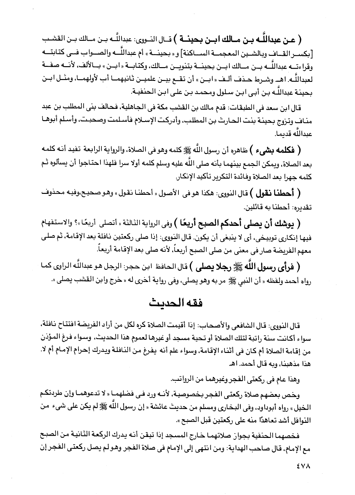 (عن عبد اللَّه بن مالك ابن بحينة) قال النووي: عبد اللَّه بن مالك بن القشب [بكسر القاف وبالشين المعجمة الساكنة] و"بحينة" أم عبد اللَّه والصواب في كتابته وقراءته عبد اللَّه بن مالك ابن بحينة بتنوين مالك، وكتابة "ابن" بالألف، لأنه صفة لعبد اللَّه. اهـ. وشرط حذف ألف "ابن" أن تقع بين علمين ثانيهما أب لأولهما، ومثل ابن بحينة عبد اللَّه بن أبي ابن سلول ومحمد بن علي ابن الحنفية.