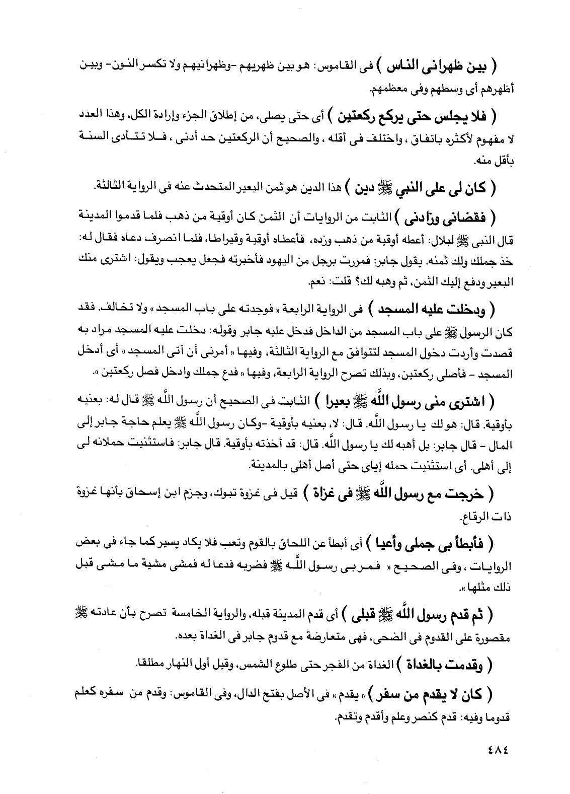 (ودخلت عليه المسجد) في الرواية الرابعة "فوجدته على باب المسجد" ولا تخالف. فقد كان الرسول صلى الله عليه وسلم على باب المسجد من الداخل فدخل عليه جابر وقوله: دخلت عليه المسجد مراد به قصدت وأردت دخول المسجد لتتوافق مع الرواية الثالثة، وفيها "أمرني أن آتي المسجد" أي أدخل المسجد - فأصلي ركعتين، وبذلك تصرح الرواية الرابعة، وفيها "فدع جملك وادخل فصل ركعتين".