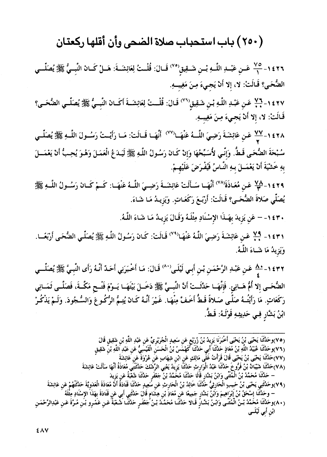 1426 - عن عبد الله بن شقيق قال: قلت لعائشة: هل كان النبي صلى الله عليه وسلم يصلي الضحى؟ قالت: لا، إلا أن يجيء من مغيبه.