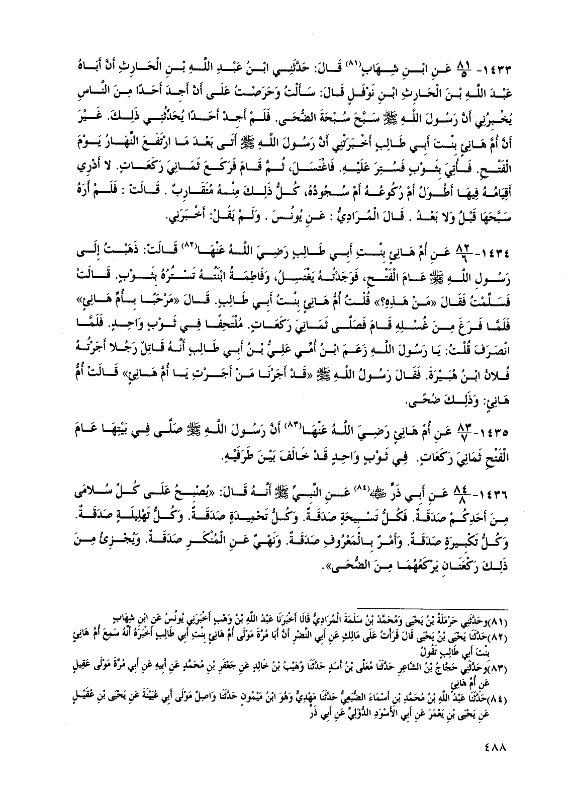 1433 - عن ابن شهاب قال: حدثني ابن عبد الله بن الحارث أن أباه عبد الله بن الحارث بن نوفل قال: سألت وحرصت على أن أجد أحدًا من الناس يخبرني أن رسول الله صلى الله عليه وسلم سبح سبحة الضحى. فلم أجد أحدًا يحدثني ذلك. غير أن أم هانئ بنت أبي طالب أخبرتني أن رسول الله صلى الله عليه وسلم أتى بعد ما ارتفع النهار يوم الفتح. فأتي بثوب فستر عليه. فاغتسل، ثم قام فركع ثماني ركعات. لا أدري أقيامه فيها أطول أم ركوعه أم سجوده، كل ذلك منه تقارب. قالت: فلم أره سبحها قبل ولا بعد. قال المرادي: عن يونس. ولم يقل: أخبرني.