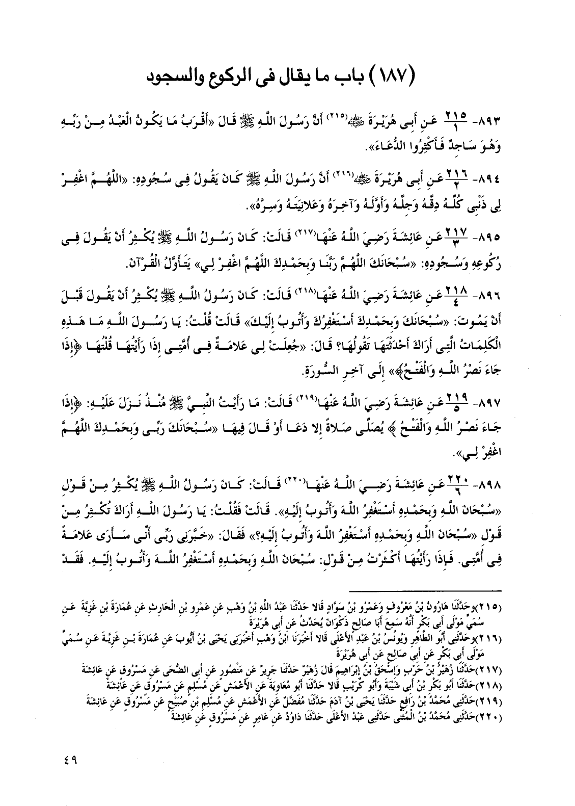 895 - عن عائشة رضي الله عنها قالت: كان رسول الله صلى الله عليه وسلم يكثر أن يقول في ركوعه وسجوده: "سبحانك اللهم ربنا وبحمدك اللهم اغفر لي" يتأول القرآن.
