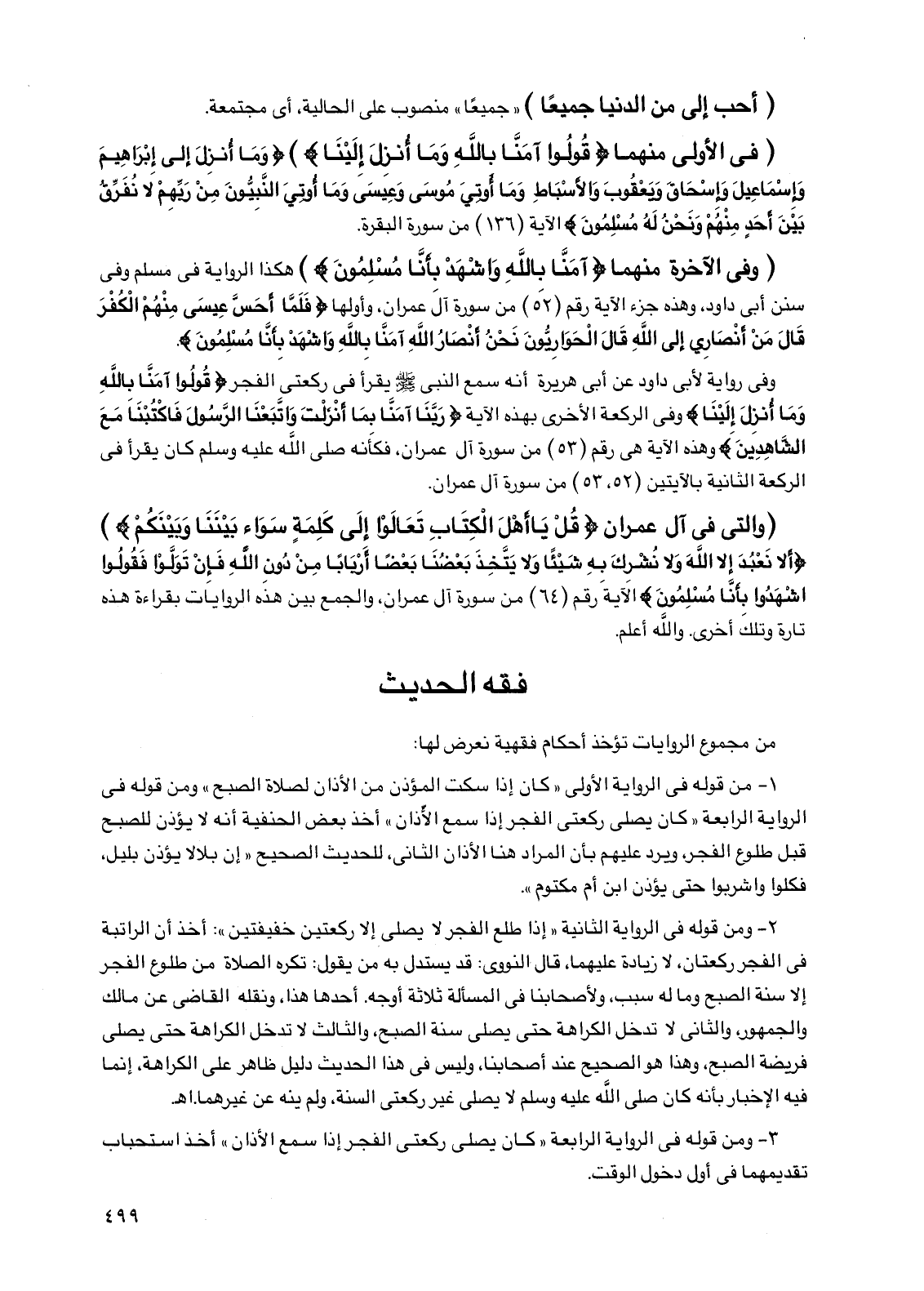 وفي رواية لأبي داود عن أبي هريرة أنه سمع النبي صلى الله عليه وسلم يقرأ في ركعتي الفجر {قولوا آمنا بالله وما أنزل إلينا} وفي الركعة الأخرى بهذه الآية {ربنا آمنا بما أنزلت واتبعنا الرسول فاكتبنا مع الشاهدين} وهذه الآية هي رقم (53) من سورة آل عمران، فكأنه صلى الله عليه وسلم كان يقرأ في الركعة الثانية بالآيتين (52، 53) من سورة آل عمران.