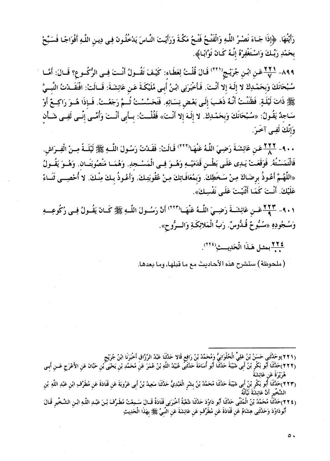 901 - عن عائشة رضي الله عنها أن رسول الله صلى الله عليه وسلم كان يقول في ركوعه وسجوده "سبوح قدوس رب الملائكة والروح".