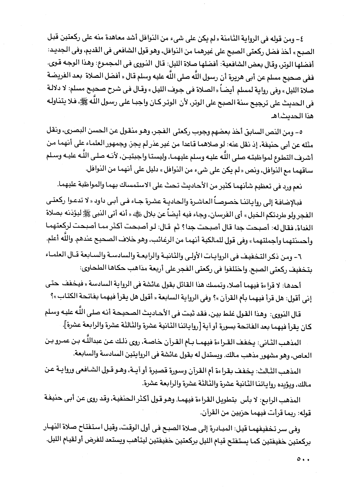 6 - ومن ذكر التخفيف في الروايات الأولى والثانية والرابعة والسادسة والسابعة قال العلماء بتخفيف ركعتي الصبح. واختلفوا في ركعتي الفجر على أربعة مذاهب حكاها الطحاوي: