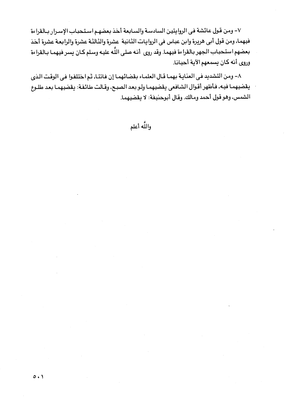 7 - ومن قول عائشة في الروايتين السادسة والسابعة أخذ بعضهم استحباب الإسرار بالقراءة فيهما، ومن قول أبي هريرة وابن عباس في الروايات الثانية عشرة والثالثة عشرة والرابعة عشرة أخذ بعضهم استحباب الجهر بالقراءة فيهما. وقد روي أنه صلى الله عليه وسلم كان يسر فيهما بالقراءة وروي أنه كان يسمعهم الآية أحيانًا.