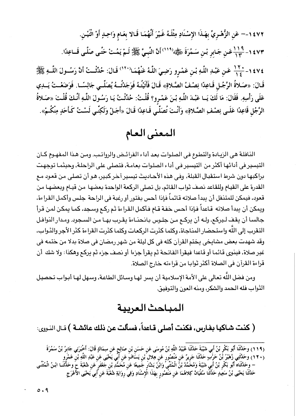 1474 - عن عبد الله بن عمرو رضي الله عنهما قال: حدثت أن رسول الله صلى الله عليه وسلم قال: "صلاة الرجل قاعدًا نصف الصلاة" قال فأتيته فوجدته يصلي جالسًا. فوضعت يدي على رأسه. فقال: ما لك يا عبد الله بن عمرو؟ قلت: حدثت يا رسول الله أنك قلت "صلاة الرجل قاعدًا على نصف الصلاة" وأنت تصلي قاعدًا قال "أجل ولكني لست كأحد منكم".