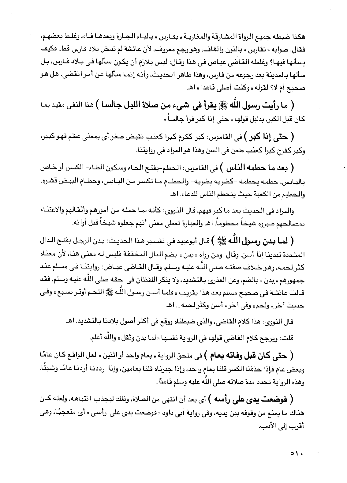 (لما بدن رسول اللَّه صلى الله عليه وسلم) قال أبو عبيد في تفسير هذا الحديث: بدن الرجل بفتح الدال المشددة تبدينًا إذا أسن. وقال: ومن رواه "بدن" بضم الدال المخففة فليس له معنى هنا، لأن معناه كثر لحمه، وهو خلاف صفته صلى اللَّه عليه وسلم. وقال القاضي عياض: روايتنا في مسلم عند جمهورهم "بدن" بالضم، وعن العذري بالتشديد، ولا ينكر اللفظان في حقه صلى اللَّه عليه وسلم، فقد قالت عائشة في صحيح مسلم بعد هذا بقريب "فلما أسن رسول اللَّه صلى الله عليه وسلم اللحم أوتر بسبع" وفي حديث آخر "ولحم" وفي آخر "أسن وكثر لحمه". اهـ.