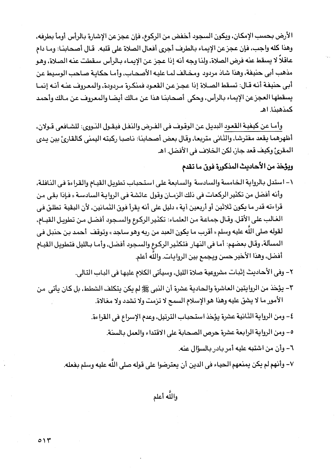 1 - استدل بالرواية الخامسة والسادسة والسابعة على استحباب تطويل القيام والقراءة في النافلة، وأنه أفضل من تكثير الركعات في ذلك الزمان وقول عائشة في الرواية السادسة "فإذا بقي من قراءته قدر ما يكون ثلاثين أو أربعين آية" دليل على أنه يقرأ فوق الثمانين، لأن البقية تطلق في الغالب على الأقل. وقال جماعة من العلماء: تكثير الركوع والسجود أفضل من تطويل القيام، لقوله صلى اللَّه عليه وسلم "أقرب ما يكون العبد من ربه وهو ساجد" وتوقف أحمد بن حنبل في المسألة، وقال بعضهم: أما في النهار فتكثير الركوع والسجود أفضل، وأما بالليل فتطويل القيام أفضل، وهذا الأخير حسن ويجمع بين الروايات. واللِّه أعلم.
