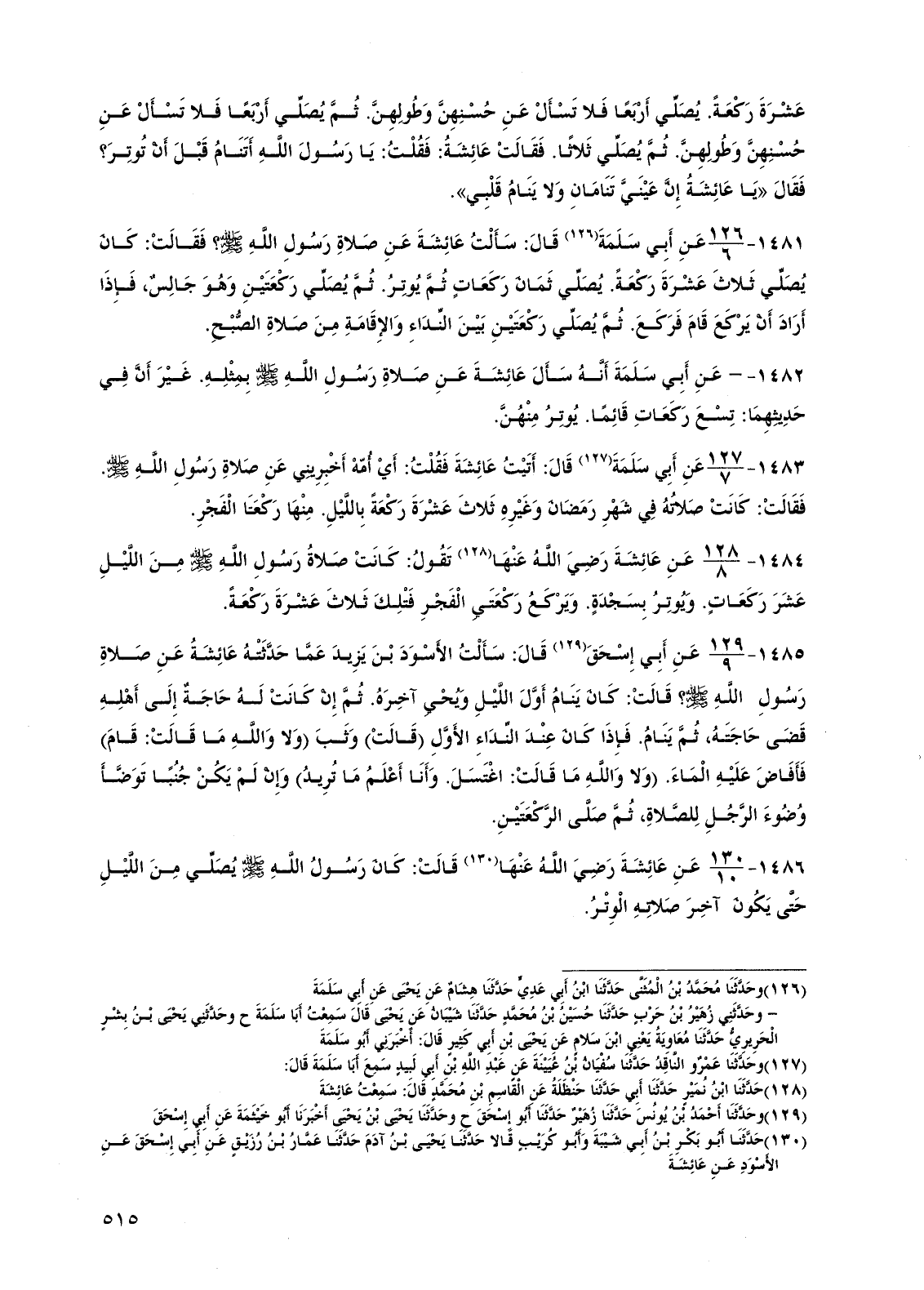 1481 - عن أبي سلمة قال: سألت عائشة عن صلاة رسول الله صلى الله عليه وسلم؟ فقالت: كان يصلي ثلاث عشرة ركعة. يصلي ثمان ركعات ثم يوتر. ثم يصلي ركعتين وهو جالس، فإذا أراد أن يركع قام فركع. ثم يصلي ركعتين بين النداء والإقامة من صلاة الصبح.