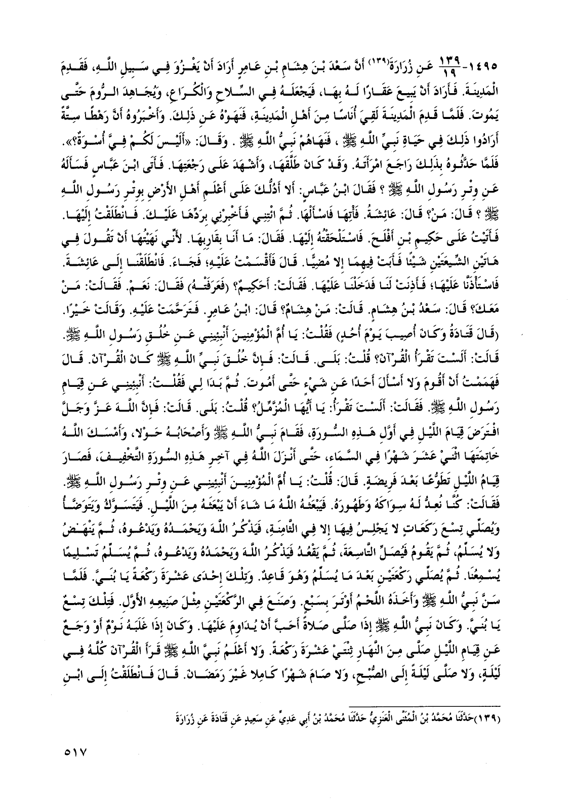 1495 - عن زرارة أن سعد بن هشام بن عامر أراد أن يغزو في سبيل الله، فقدم المدينة. فأراد أن يبيع عقارًا له بها، فيجعله في السلاح والكراع، ويجاهد الروم حتى يموت. فلما قدم المدينة لقي أناسًا من أهل المدينة، فنهوه عن ذلك. وأخبروه أن رهطًا ستة أرادوا ذلك في حياة نبي الله صلى الله عليه وسلم، فنهاهم نبي الله صلى الله عليه وسلم. وقال: "أليس لكم في أسوة؟ ". فلما حدثوه بذلك راجع امرأته. وقد كان طلقها، وأشهد على رجعتها. فأتى ابن عباس فسأله عن وتر رسول الله صلى الله عليه وسلم؟ فقال ابن عباس: ألا أدلك على أعلم أهل الأرض بوتر رسول الله صلى الله عليه وسلم؟ قال: من؟ قال: عائشة. فأتها فاسألها. ثم ائتني فأخبرني بردها عليك. فانطلقت إليها. فأتيت على حكيم بن أفلح. فاستلحقته إليها. فقال: ما أنا بقاربها. لأني نهيتها أن تقول في هاتين الشيعتين شيئًا فأبت فيهما إلا مضيًا. قال فأقسمت عليه؛ فجاء. فانطلقنا إلى عائشة فاستأذنا عليها؛ فأذنت لنا فدخلنا عليها. فقالت: أحكيم؟ (فعرفته) فقال: نعم. فقالت: من معك؟ قال: سعد بن هشام. قالت: من هشام؟ قال: ابن عامر. فترحمت عليه. وقالت خيرًا. (قال قتادة وكان أصيب يوم أحد) فقلت: يا أم المؤمنين أنبئيني عن خلق رسول الله صلى الله عليه وسلم. قالت: ألست تقرأ القرآن؟ قلت: بلى. قالت: فإن خلق نبي الله صلى الله عليه وسلم كان القرآن. قال فهممت أن أقوم ولا أسأل أحدًا عن شيء حتى أموت. ثم بدا لي فقلت: أنبئيني عن قيام رسول الله صلى الله عليه وسلم. فقالت: ألست تقرأ: يا أيها المزمل؟ قلت: بلى.