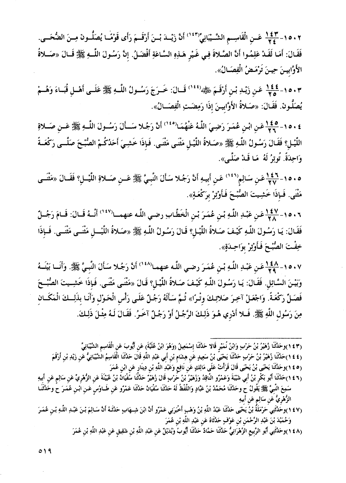 1502 - عن القاسم الشيباني أن زيد بن أرقم رأى قومًا يصلون من الضحى. فقال: أما لقد علموا أن الصلاة في غير هذه الساعة أفضل. إن رسول الله صلى الله عليه وسلم قال "صلاة الأوابين حين ترمض الفصال".
