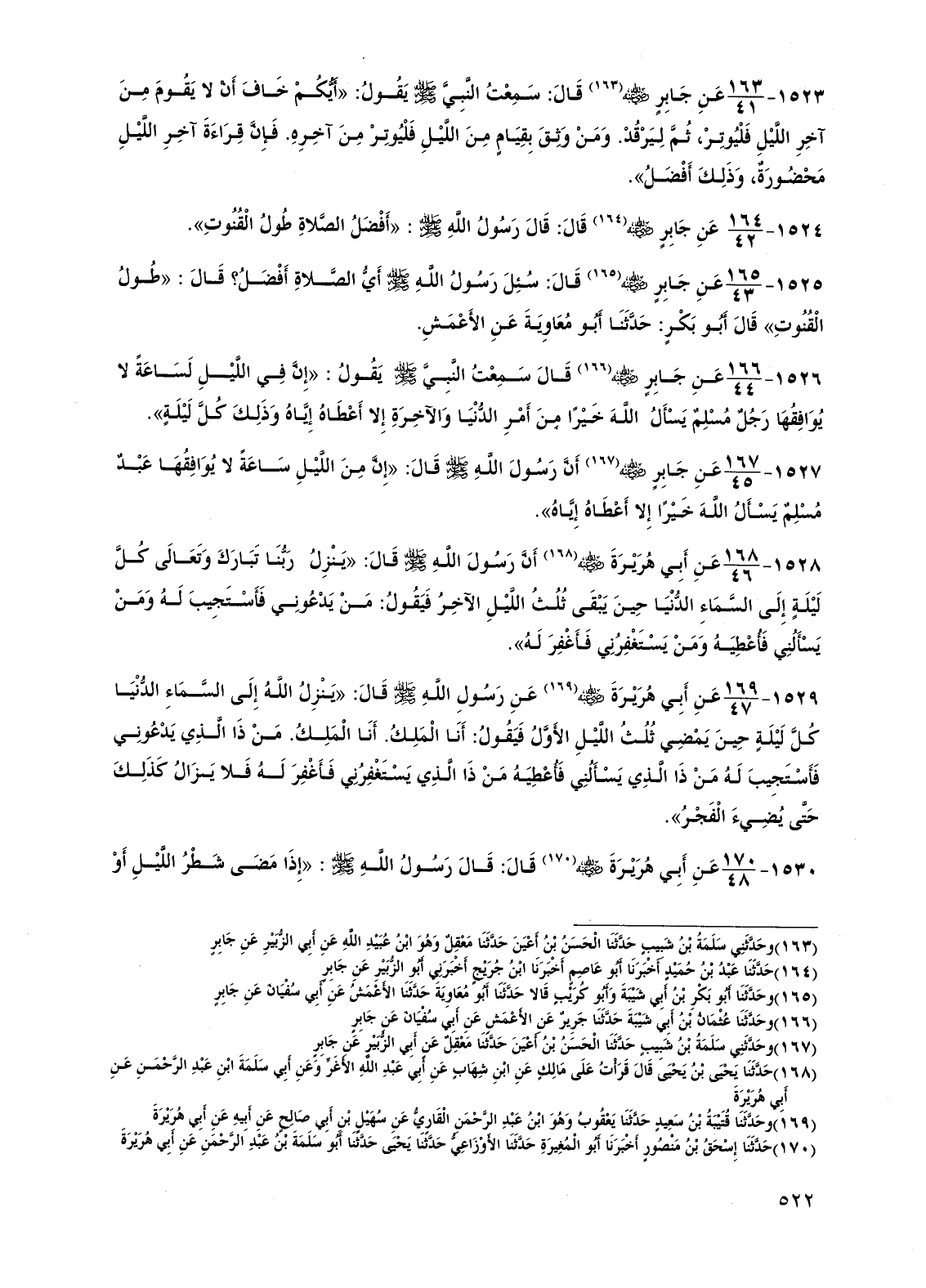 1525 - عن جابر رضي الله عنه قال: سئل رسول الله صلى الله عليه وسلم أي الصلاة أفضل؟ قال: "طول القنوت" قال أبو بكر: حدثنا أبو معاوية عن الأعمش.