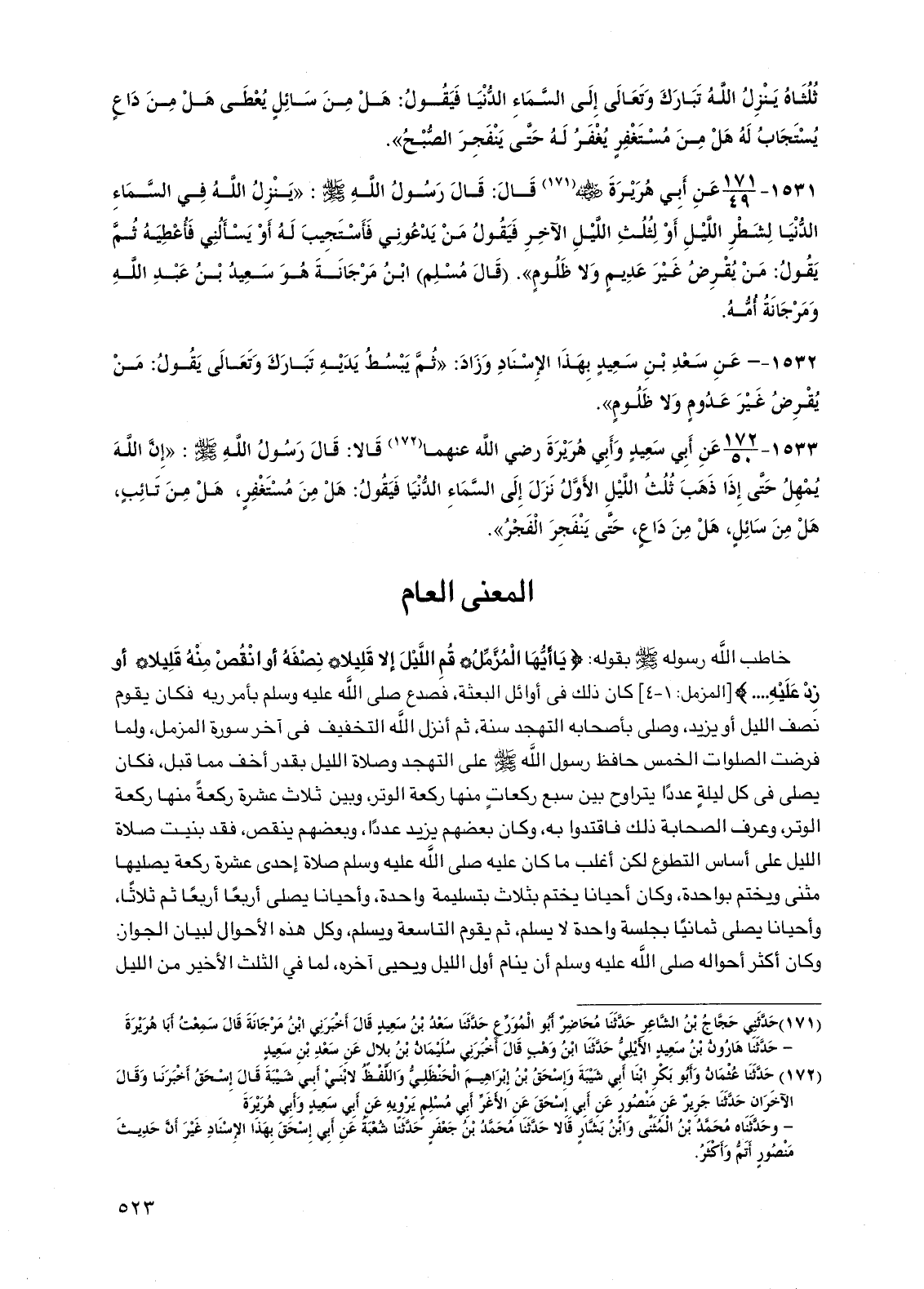 1531 - عن أبي هريرة رضي الله عنه قال: قال رسول الله صلى الله عليه وسلم: "ينزل الله في السماء الدنيا لشطر الليل أو لثلث الليل الآخر فيقول من يدعوني فأستجيب له أو يسألني فأعطيه ثم يقول: من يقرض غير عديم ولا ظلوم". (قال مسلم) ابن مرجانة هو سعيد بن عبد الله ومرجانة أمه.